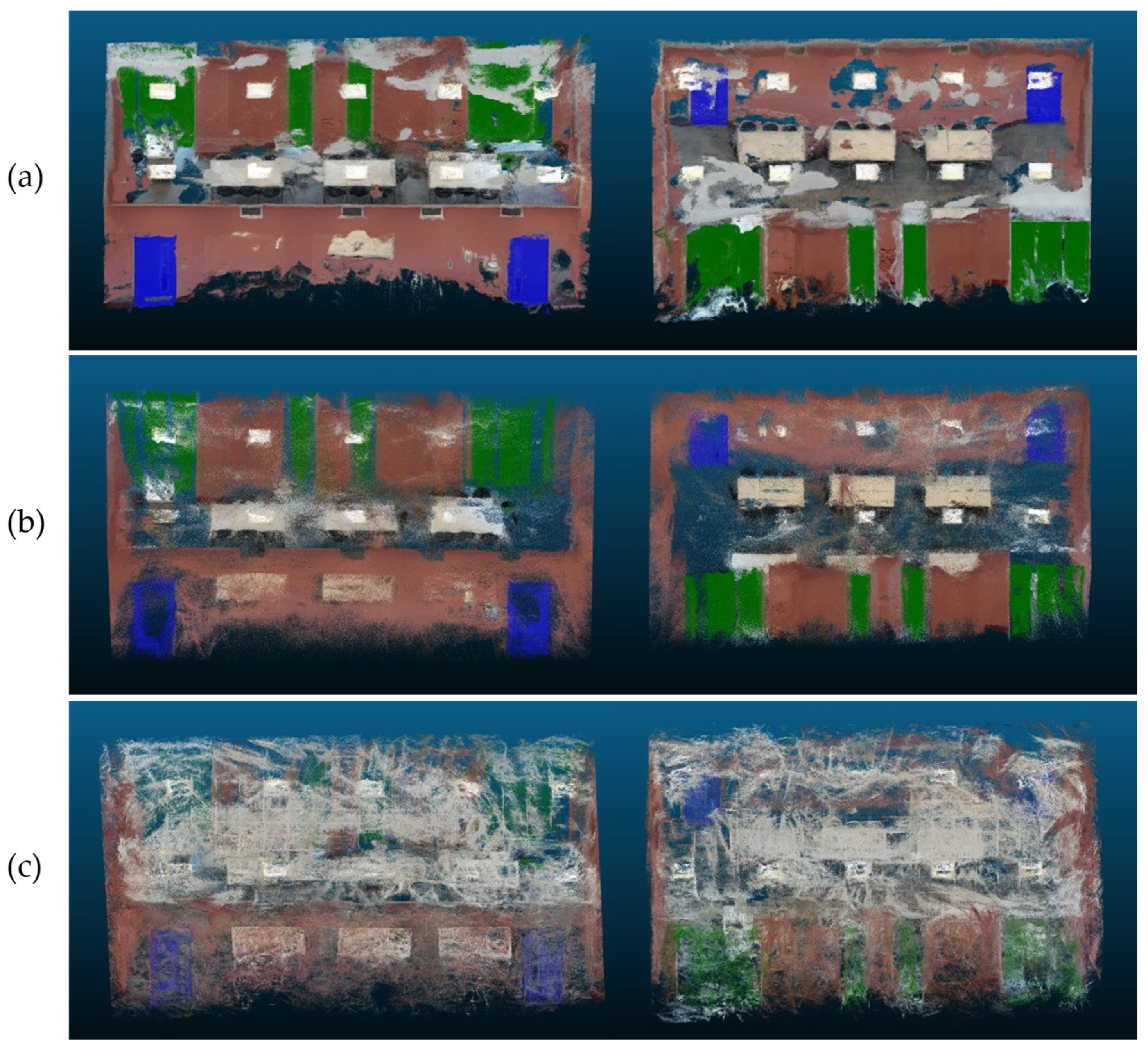 Figure 19 presents the extracted PCs from the reconstructed interior scene using each NeRF model, illustrating both front and rear views of the classroom. These color-labeled outputs visually demonstrate each reconstruction’s structural completeness and spatial clarity. Among the three models, the PC generated by Nerfacto exhibits the most consistent geometry and clean surface representation. Wall boundaries, furniture contours, and door/window regions appear sharp and continuous, providing a stable foundation for geometric segmentation and facilitating accurate alignment in downstream processing. The Instant-NGP output retains recognizable scene layout but introduces soft edges and localized noise, particularly near object boundaries. While core architectural features remain identifiable, the reduced edge sharpness may introduce spatial ambiguity during plane fitting or clustering, affecting the precision of wall, window, and door extraction.