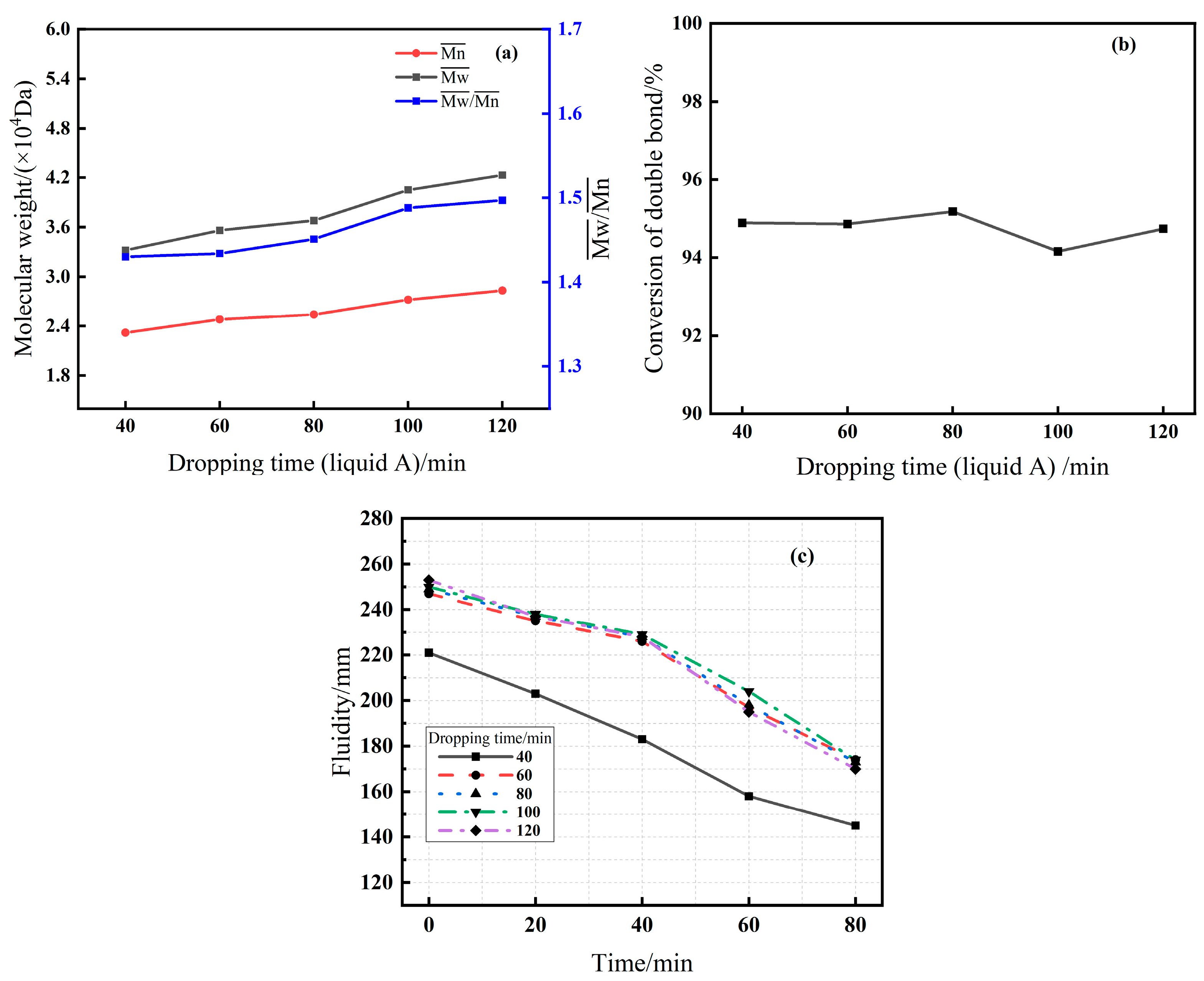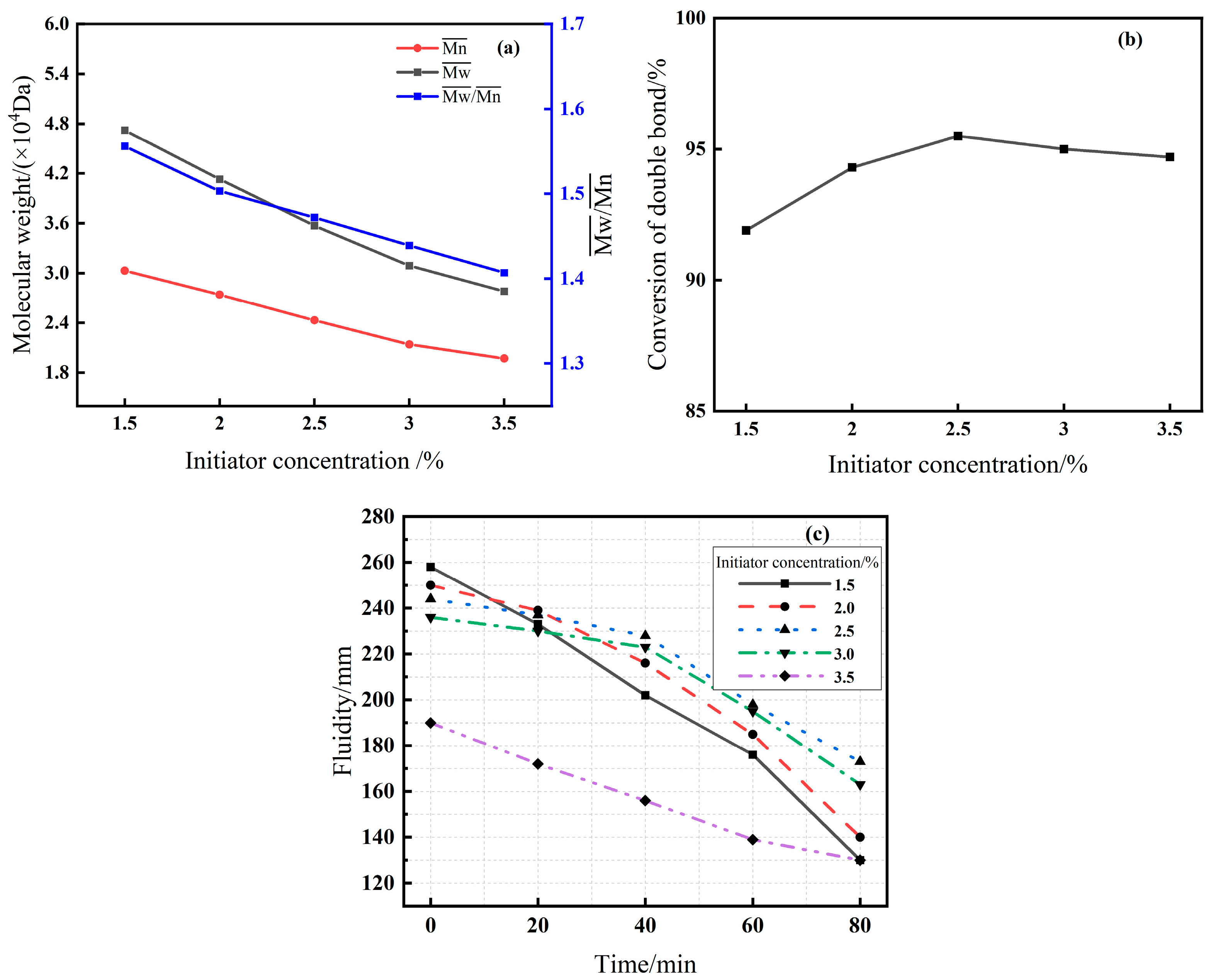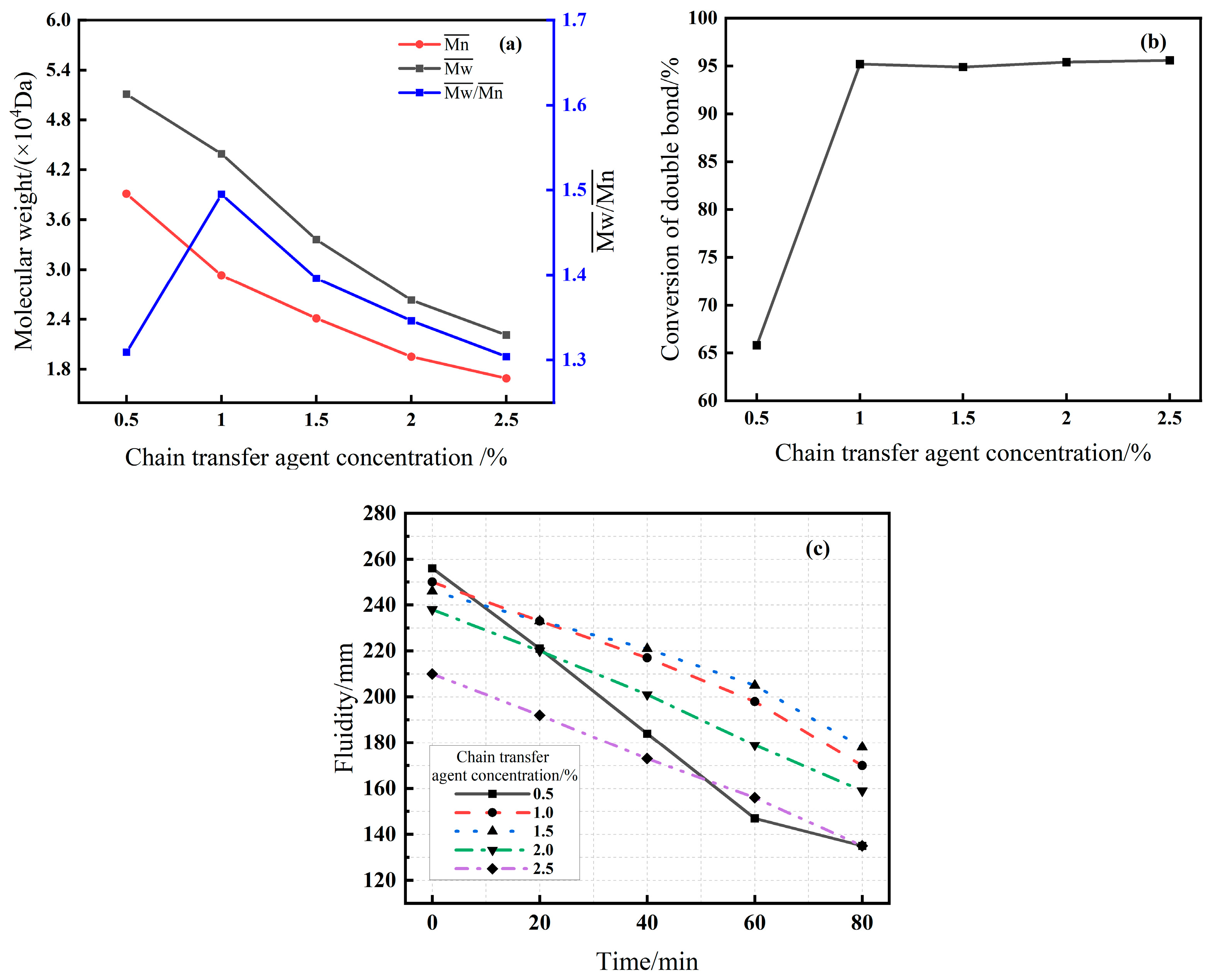 - Leveraging the high reactivity of the vinyloxy double bond in EPEG, this study establishes a robust low-temperature (20 °C) synthesis protocol that achieves high conversion (>95%) with significantly reduced energy consumption. By systematically varying five key process parameters, a clear “synthesis–structure–property” relationship is constructed. Crucially, the weight-average molecular weight (Mw) is identified as the central regulator that balances initial dispersion and slump retention, mediated by mechanisms involving adsorption behavior and pore solution surface tension.