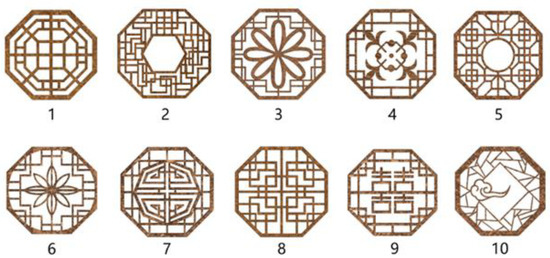 The questionnaire used ten Chinese carved windows as the stimulus images. The stimuli used in the experiment were designed and drawn by researchers. Each stimulus window image was presented at an identical size, resolution, and viewing angle, with uniform backgrounds (neutral colors and no contextual details), removing potential confounds related to surrounding architectural features or environmental contexts. This selection aims to balance the presentation of both the unity and variety of the windows, ensuring a more controlled evaluation of aesthetic preferences in the formal study. Furthermore, these images are set to appear randomly in order to avoid sequential effects in questionnaire surveys. In this section, only the stimulus images are shown, and there is no text introduction or guide involved.