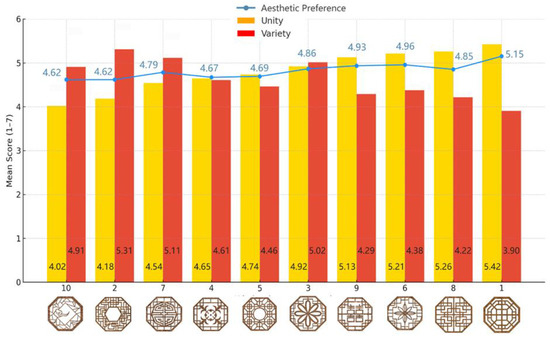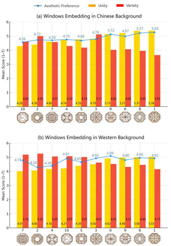 The results of the participants’ ratings of the scales were summarized, including the mean unity, variety, and aesthetic preference scores for each window, as shown in Figure 2 and Table 2.