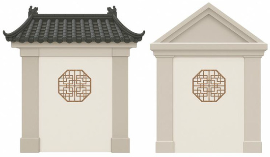 To ensure consistency and control over confounding variables, both backgrounds shared a similar base structure and material. The difference between them was the design of the eaves, with the Chinese background featuring traditional Chinese eaves and the Western background incorporating Western-style eaves. The intentional approach restricted the stylistic manipulation to the eaves design while keeping other features constant. Eaves are highly diagnostic of traditional Chinese versus Western architectural styles and therefore provide a minimal yet powerful cue for prototype-based style categorization. Moreover, as a quasi-experimental design, it was essential to ensure that the key variable was clearly and feasibly manipulable; focusing the manipulation on the eaves thus helped to maintain experimental control, as shown in Figure 3.