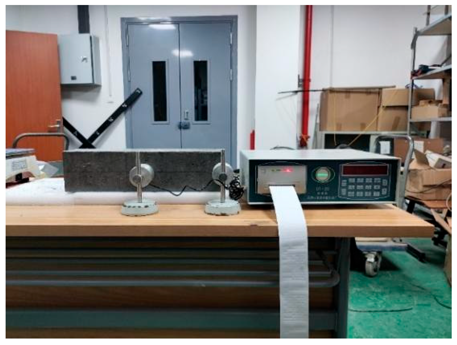 39], this research utilized 100 × 100 × 100 mm cubic specimens for both the compressive strength and splitting tensile strength tests. For the flexural strength test, 100 × 100 × 400 mm prismatic specimens were used; the test loading rate, along with the mechanical property-testing instruments and loading setups, were consistent with the parameters employed in our team’s prior study [
