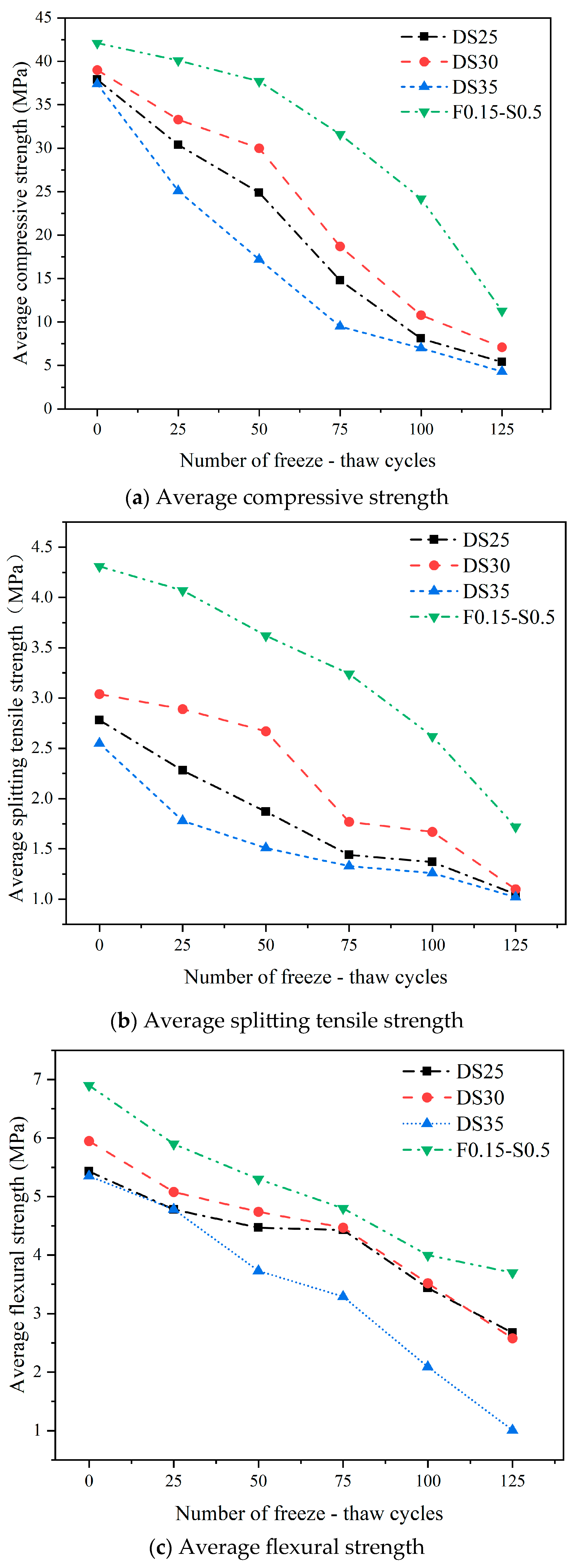 In conclusion, the four mix-proportion designs in this study (DS25, DS30, DS35, F0.15-S0.5) were capable of effectively addressing the following core scientific inquiries: (1) Did the optimal desert–sand dosage remain optimal under freeze–thaw conditions? (2) Could the optimal fiber combination effectively enhance the durability of the optimal matrix in freeze–thaw environments? This focused experimental design enabled a more profound research approach and led to more conclusive and distinct findings. The experimental mix proportions are listed in