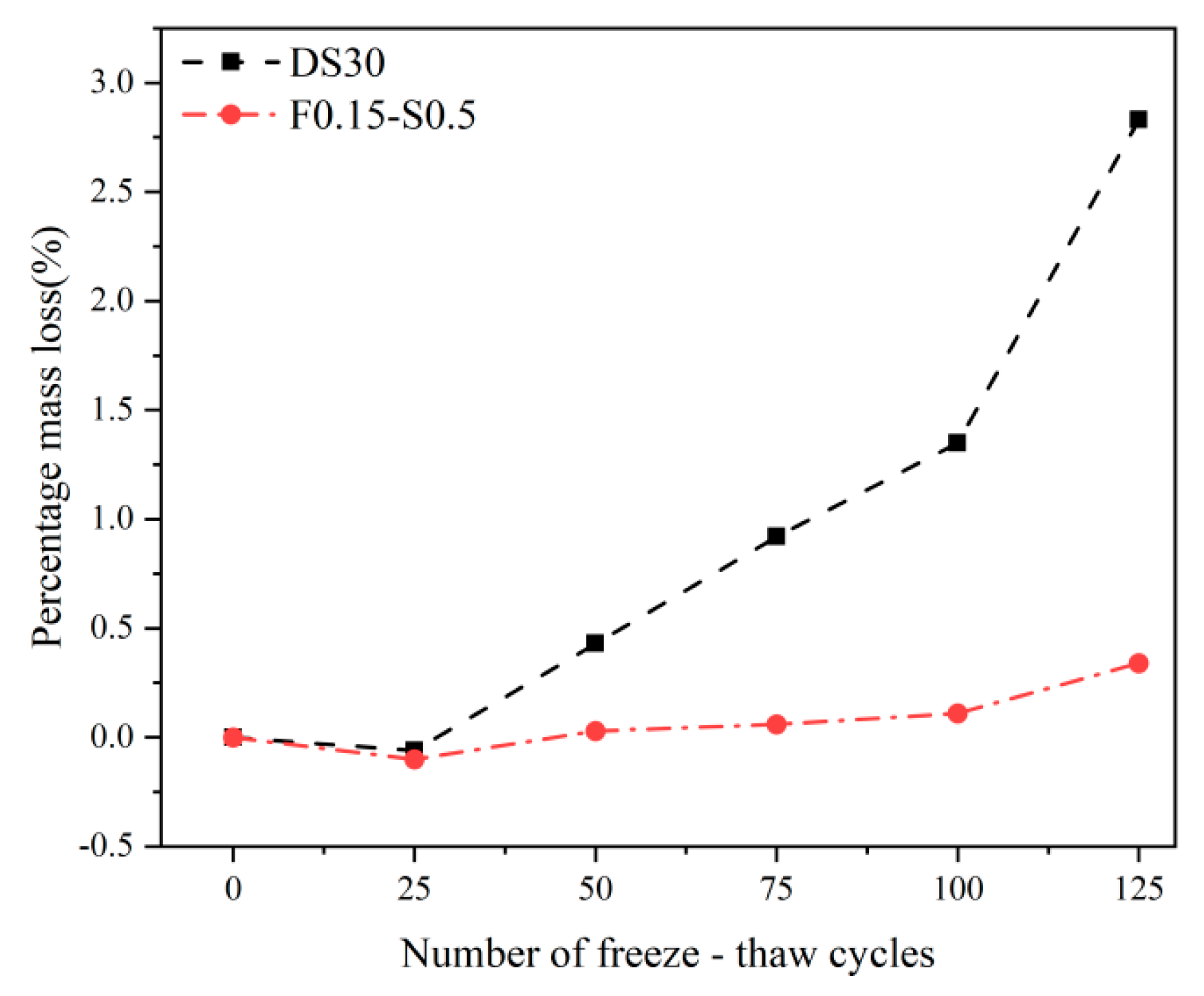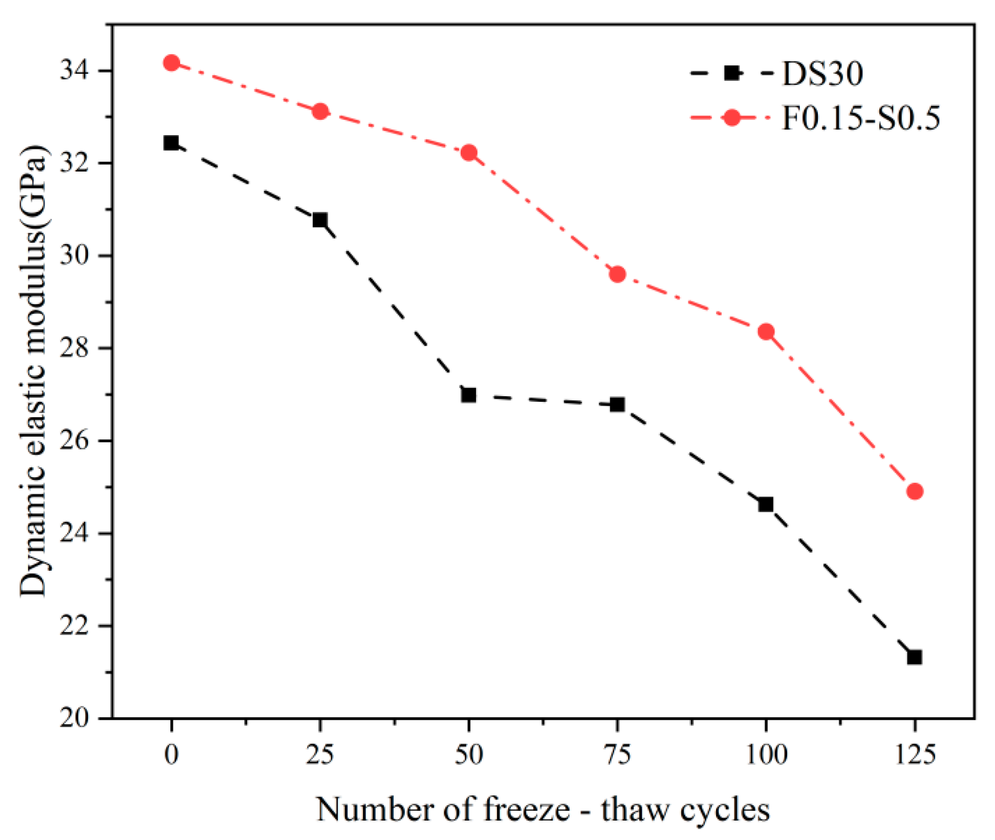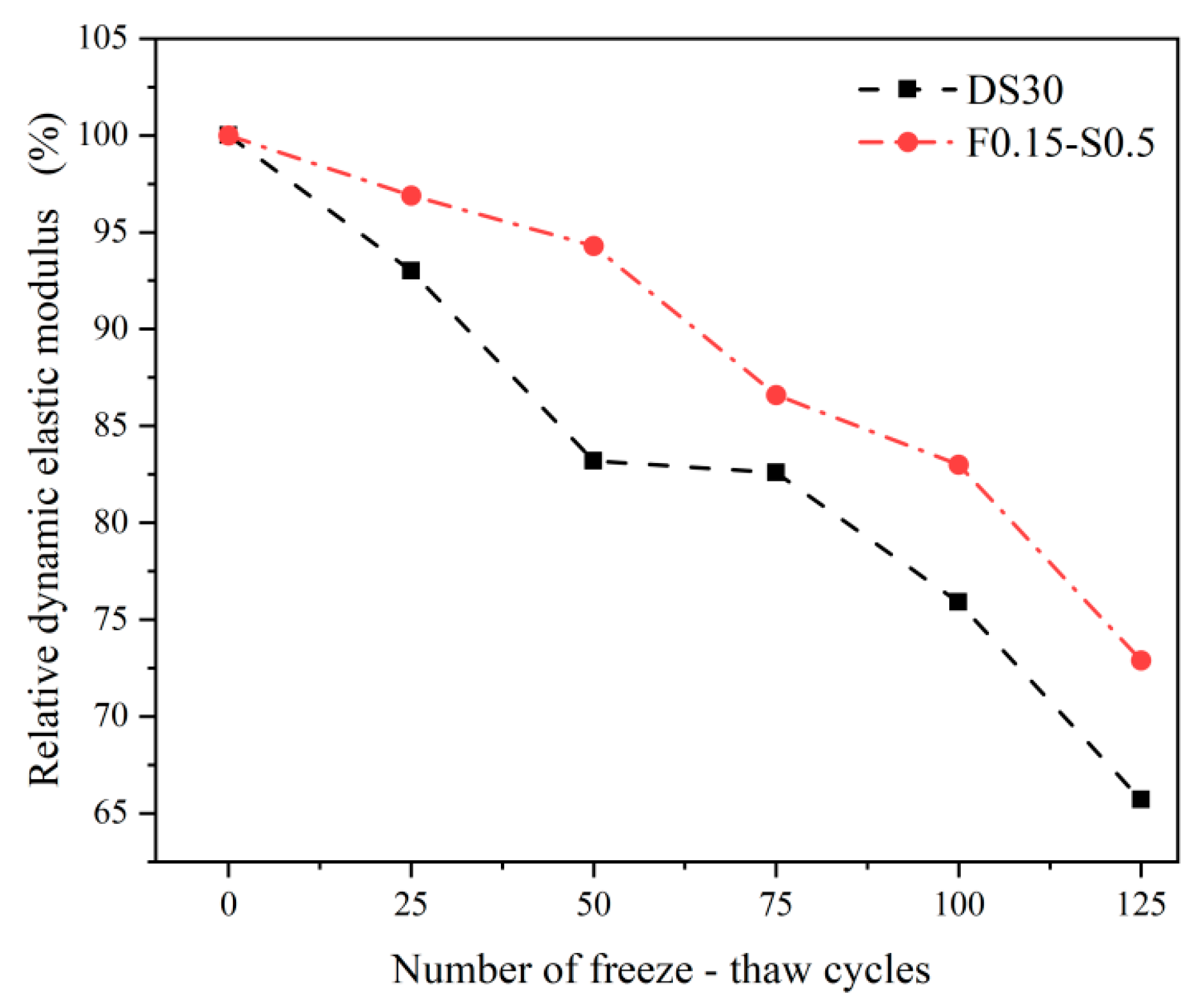 To directly evaluate the degree of improvement in the freeze–thaw durability and the underlying synergy mechanism upon the introduction of the optimal fiber combination into the pre-determined optimal matrix (DS30), we retained only the most effective hybrid-fiber group, F0.15-S0.5. This decision was made with the intention of emphasizing the verification of the effectiveness of this optimal combination in durability-related scenarios, rather than re-validating the already-established effects of single fibers.