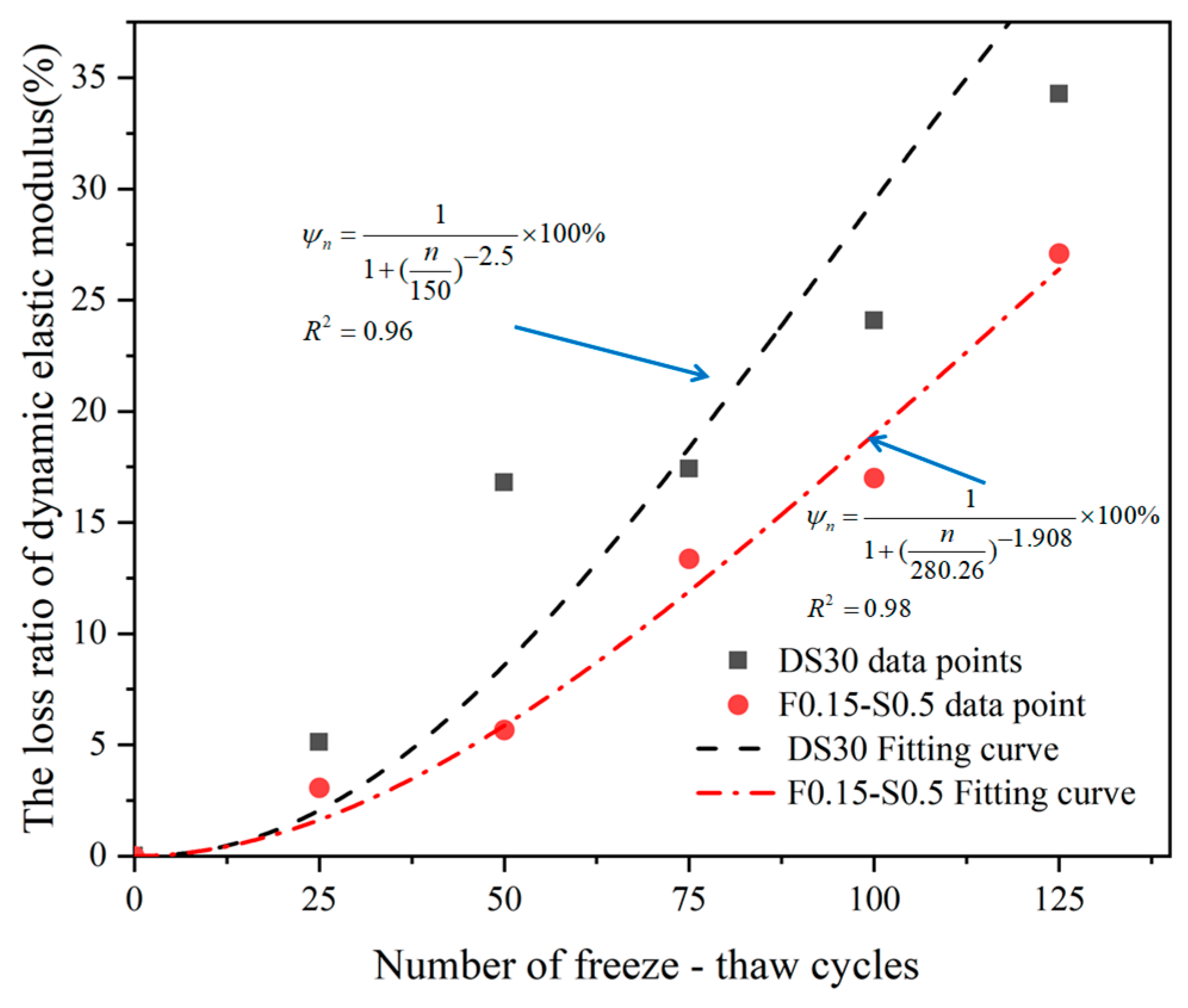 P(n) represents the specimen’s relative dynamic elastic modulus post-n freeze–thaw cycles, in percentage (%) (dimensionless parameter, reflecting the integrity of the material internal structure after freeze–thaw); n represents the freeze–thaw cycle count, in cycle (experimental variable, with values of 0, 25, 50, 75, 100, 125 cycles in this study); A represents the initial difference relative to the dynamic elastic modulus (when n = 0) and the final stable value, in percentage (%) (dimensionless parameter, reflecting the total attenuation amplitude of the material’s elastic modulus from the initial state to the stable state after late freeze–thaw); B represents the attenuation constant, in cycle (determining the rate at which the relative dynamic elastic modulus declines as the freeze–thaw cycle count increases; a higher B value denotes a slower attenuation rate and superior freeze–thaw resistance of the material); C represented the relative dynamic elastic modulus’ stable value in the late freeze–thaw cycle stage, in percentage (%) (dimensionless parameter, which reflects the lower limit of the relative dynamic elastic modulus when the material’s internal damage saturates, following repeated freeze–thaw cycles).
