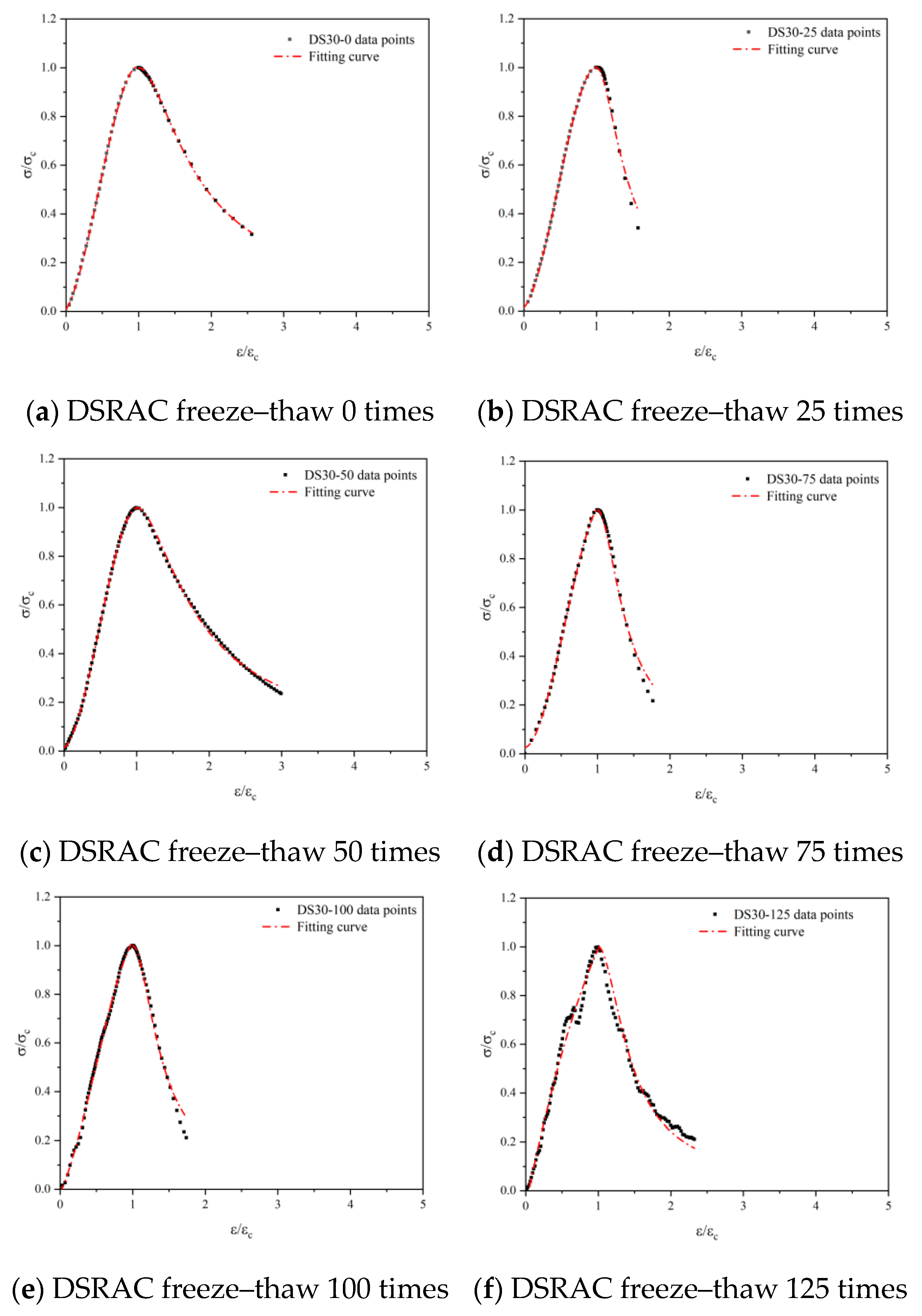 (4) The freeze–thaw damage models constructed using the exponential function and Aas-Jakobsen function were verified to precisely characterize the evolution pattern of the relative dynamic elastic modulus with freeze–thaw cycle counts, with coefficients of determination R2 ≥ 0.96. Guo’s constitutive model was verified to effectively represent the changes in the stress–strain relationship before and after freeze–thaw, and the goodness-of-fit was higher than 0.97 for all cases.