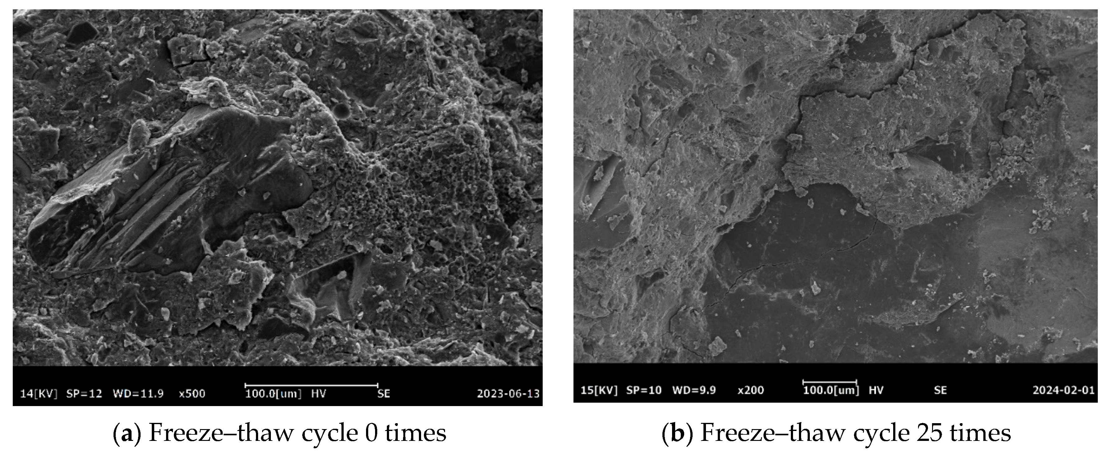 Figure 12a), its microstructure was relatively compact, with a low porosity. The interfacial transition zone (ITZ) between cement paste and aggregates remained continuous and structurally intact, demonstrating an excellent initial condition. After 25 freeze–thaw cycles (