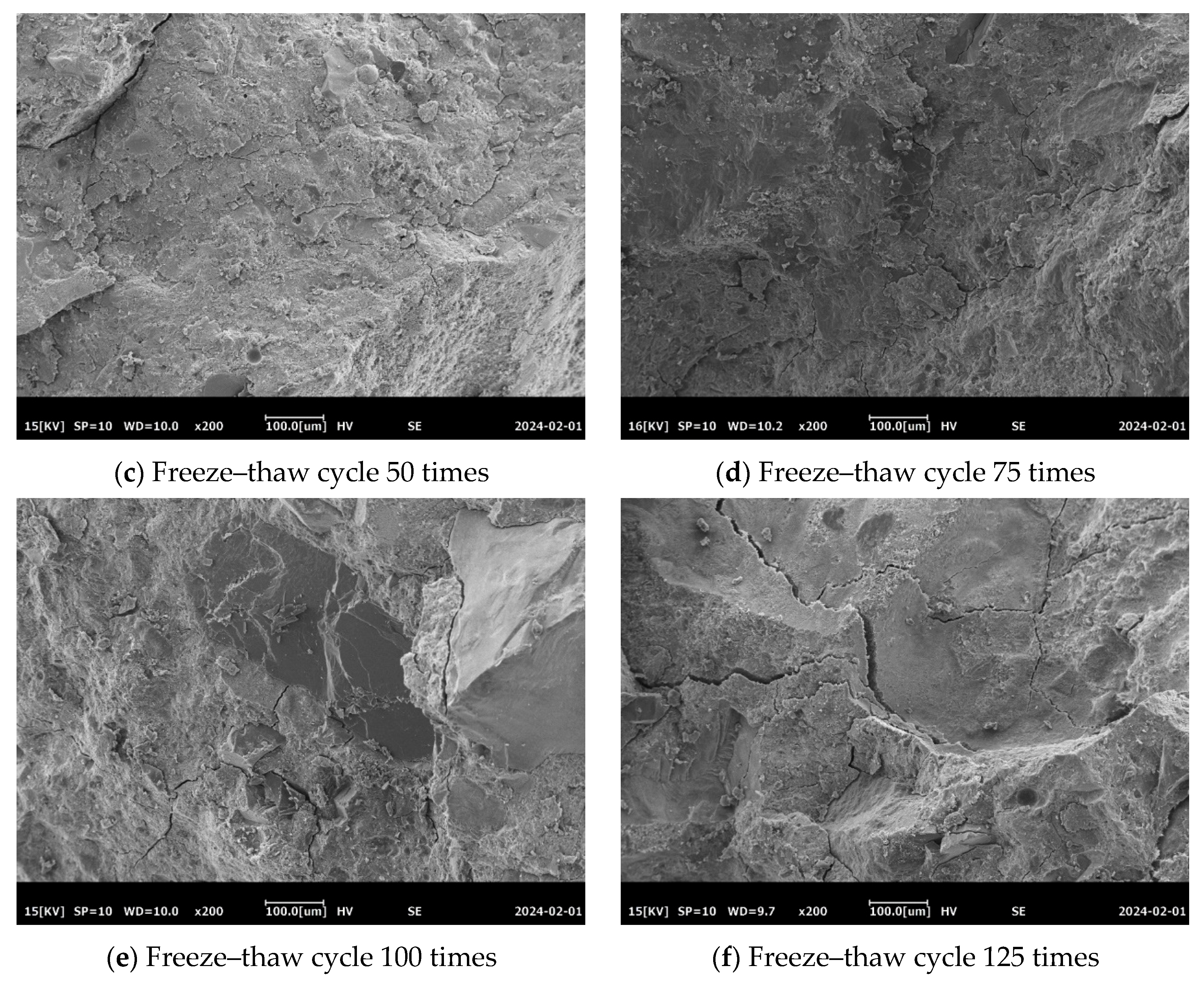 To explore the influence of freeze–thaw cycles on the microstructural characteristics of materials, this study employed scanning electron microscopy (SEM) to perform micromorphological observations on the selected test specimens. The samples for SEM analysis were sourced from the inner core regions of the specimens following mechanical property tests. This approach was adopted to mitigate the influence of the cutting surface. The samples underwent a series of preparatory treatments, including drying and sputter coating with gold, before being positioned within the vacuum sample chamber. During SEM observation, the main accelerating voltage was adjusted to 15.0 kV, while the working distance was kept at roughly 15 mm. This study focused primarily on the microstructural evolution of the hybrid-fiber-reinforced group (F0.15-S0.5) under different freeze–thaw cycle counts (0, 25, 50, 75, 100, 125 cycles). For the sample that had not undergone any freeze–thaw cycles (0 cycles), a magnification of 500× was employed to display the initial microstructure. For specimens that had undergone freeze–thaw cycles, all observations were performed at a consistent magnification of 200×. This standardization was implemented to guarantee the direct comparability of damage patterns across different freeze–thaw cycles.