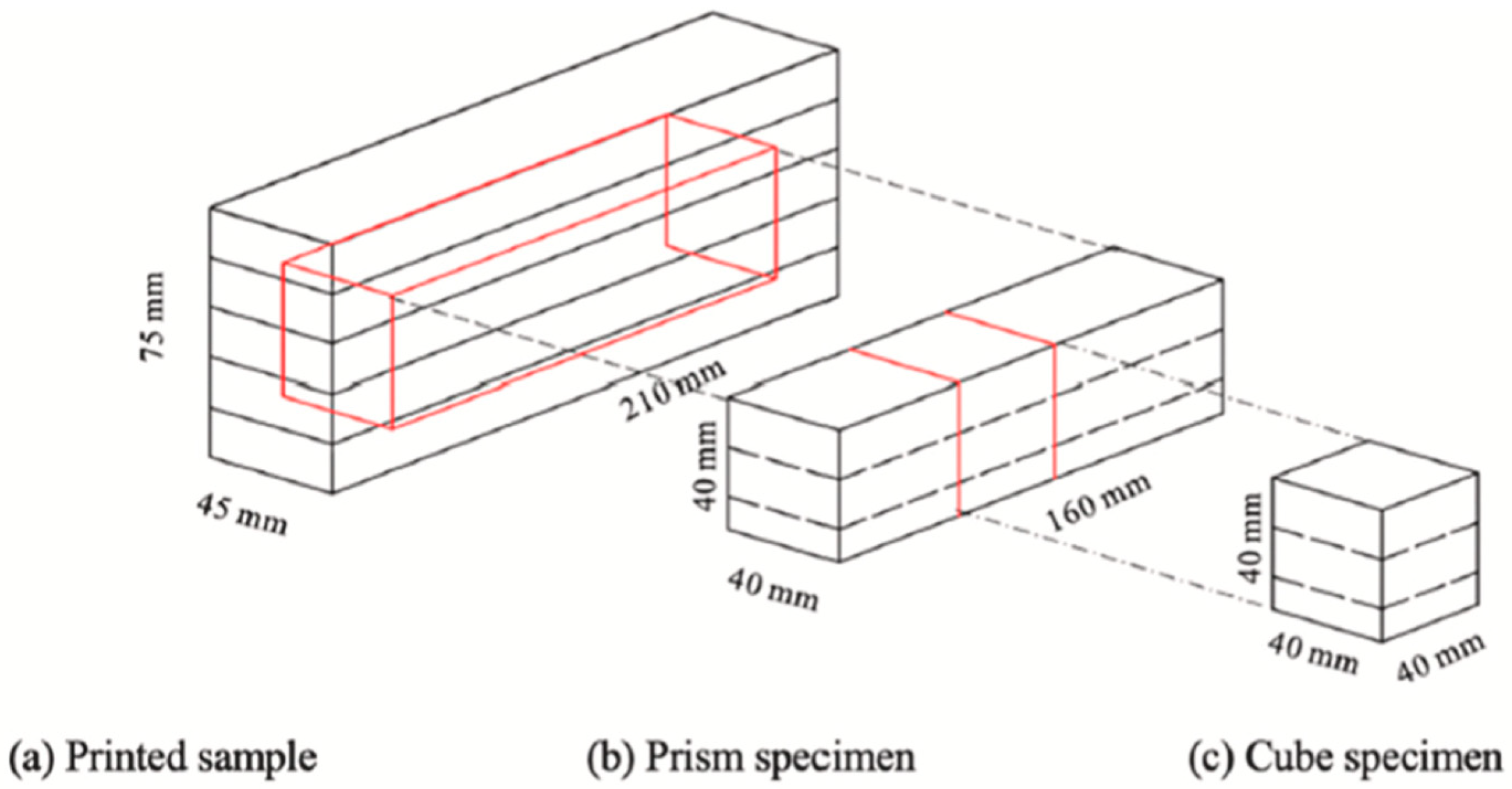 - Sun, H.Q.; Zeng, J.J.; Xie, S.S.; Xia, J.R.; Yu, S.; Zhuge, Y. Mechanical and microstructural characterization of interlayer bonding in multi-material 3D-Printed concrete. Cem. Concr. Compos. 2026, 165, 106308. [Google Scholar] [CrossRef]