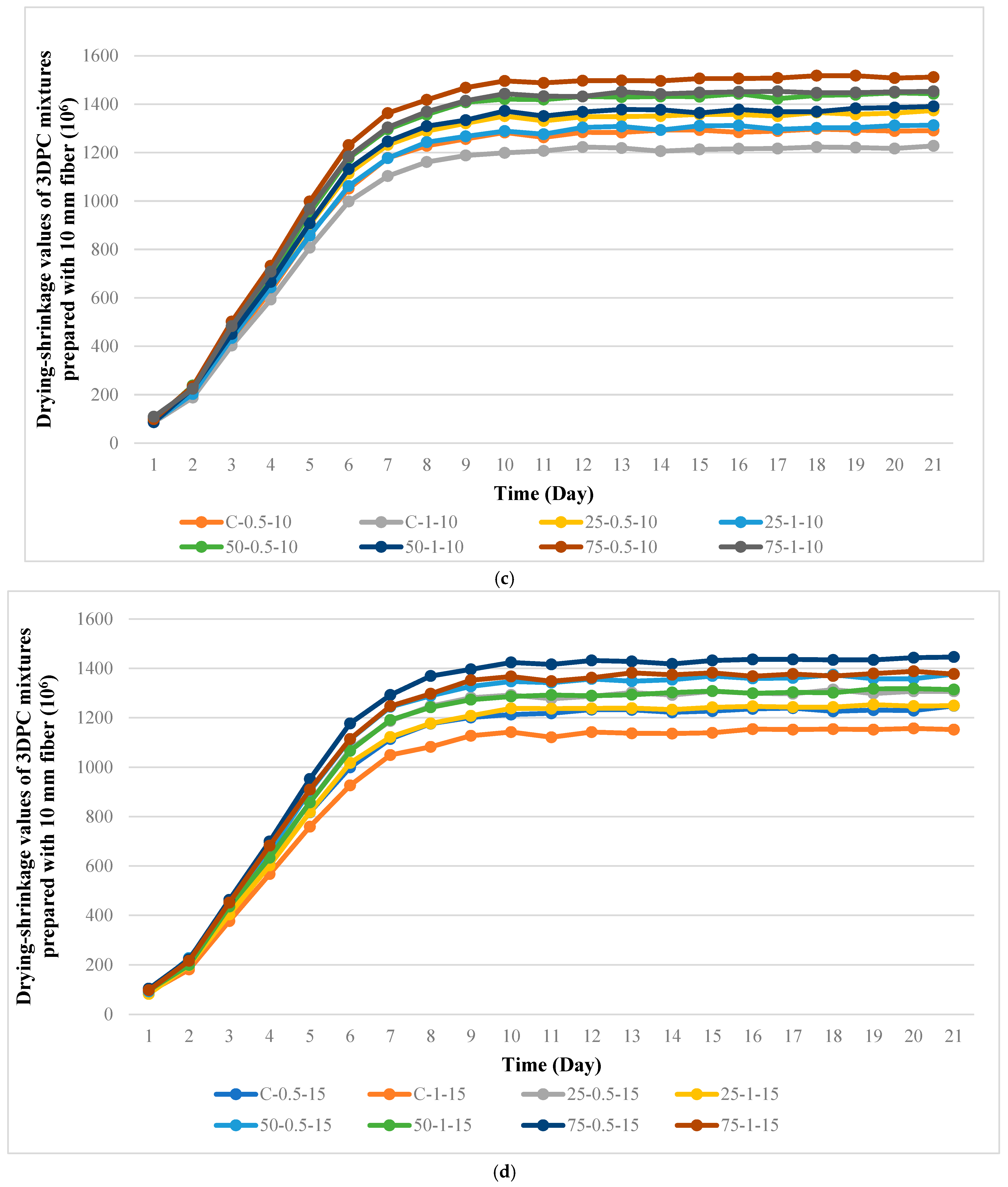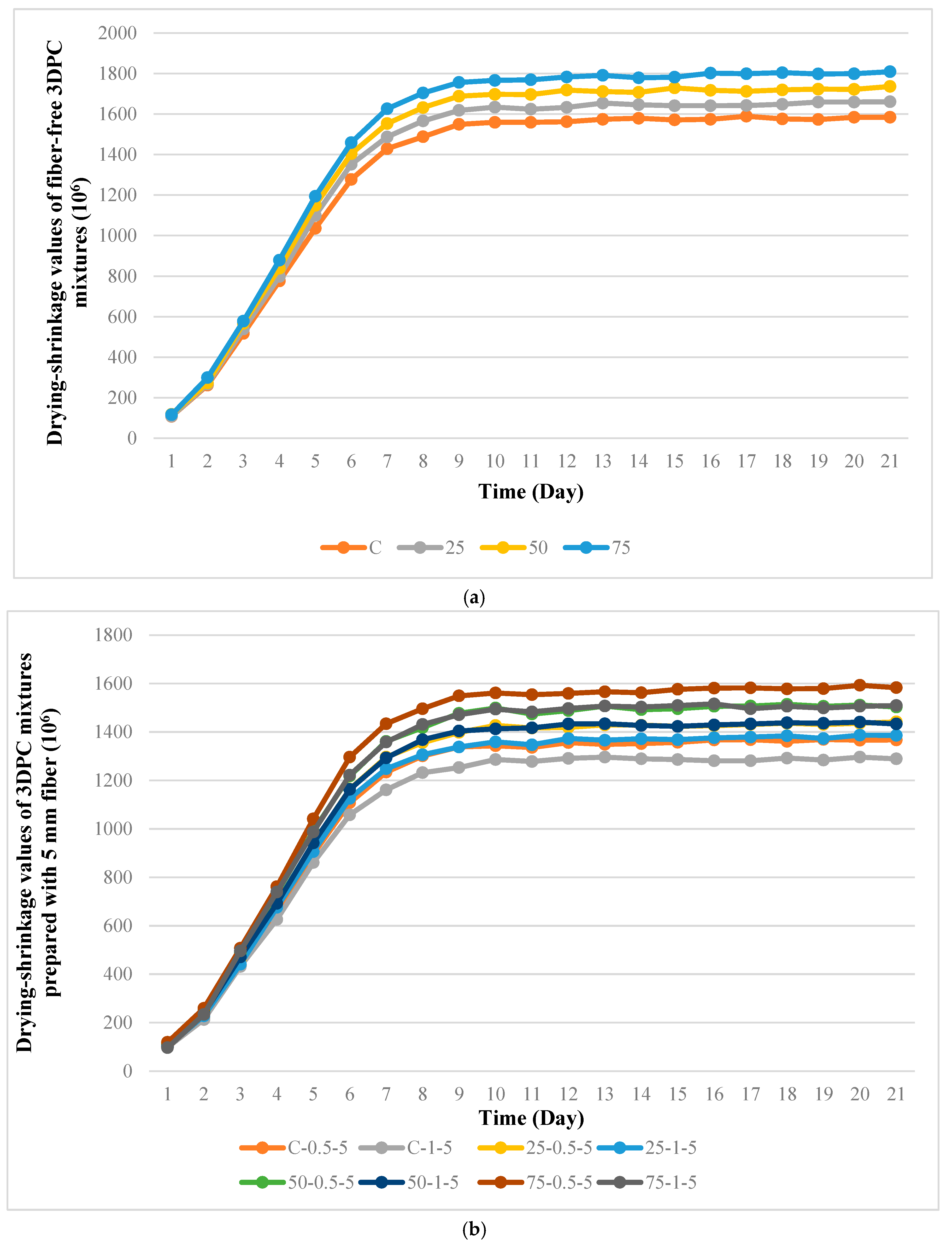 - Regardless of the BFC content, the use of waste steel fiber and increasing the fiber length resulted in a significant improvement in the drying shrinkage performance of the mixtures. The bridging effect provided by the fibers limited the formation and propagation of shrinkage cracks, thus contributing to this positive effect.