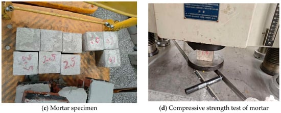 Table 2 displays the compressive strengths of the nine mortar specimens. The results indicate that the average compressive strength of the bricks is 10.4 MPa, with a coefficient of variation of 0.08 and a standard deviation of 9.5 MPa. The measured strengths of the three groups of mortar specimens were 3.3 MPa, 6.9 MPa, and 9.6 MPa, respectively, exceeding 2.5 MPa, 5 MPa, and 7.5 MPa. Their strength grades were therefore assessed as M2.5, M5, and M7.5.