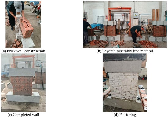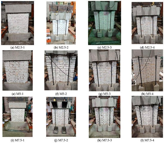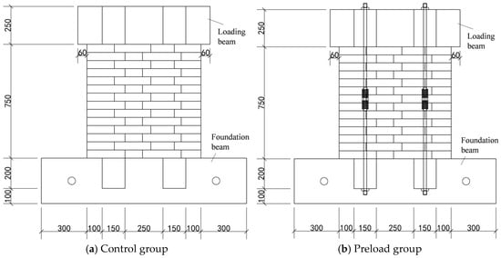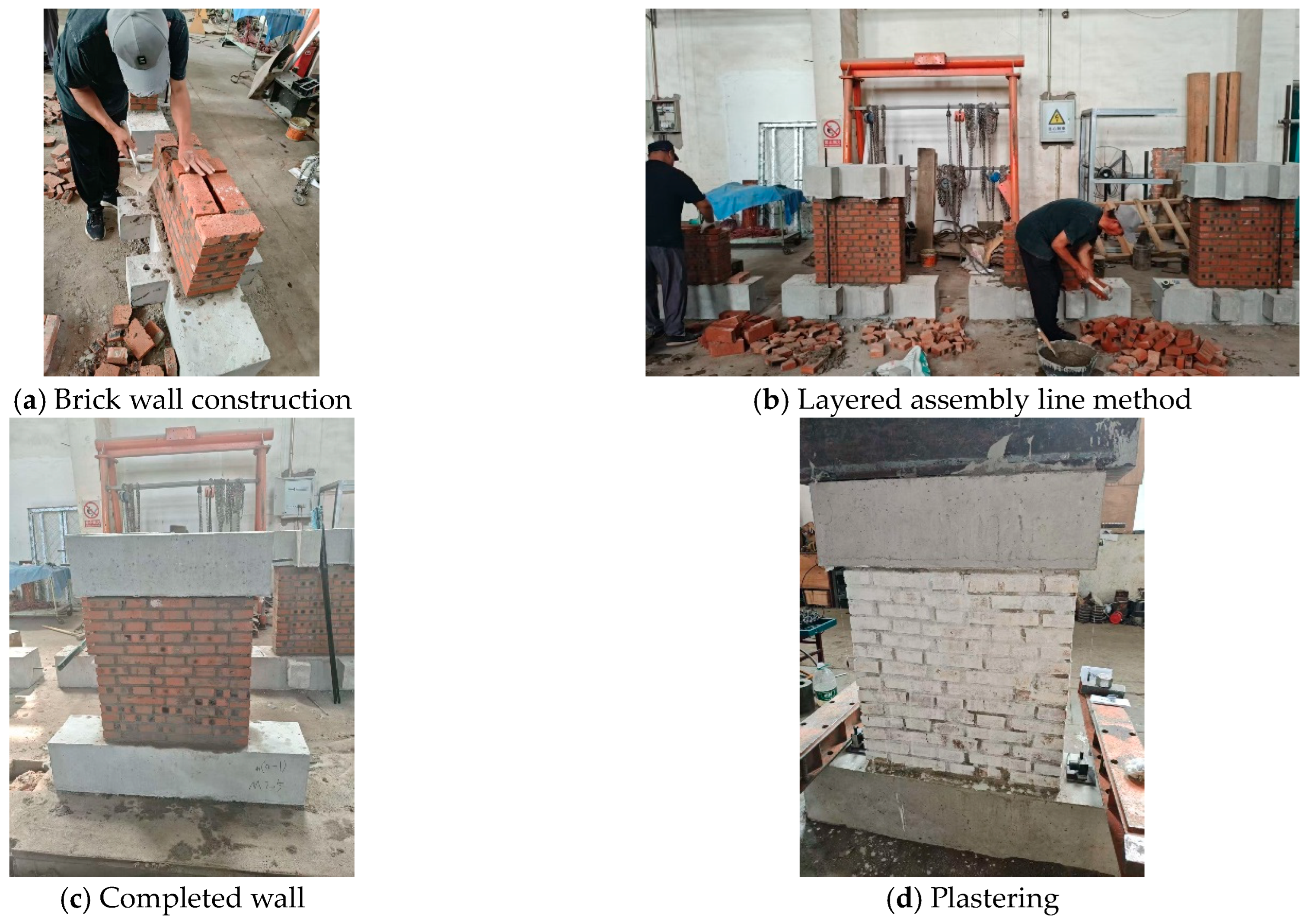 Twelve brick walls were constructed using a stretcher–header bond pattern. The walls had face dimensions of 750 mm × 750 mm and a thickness of 240 mm. The foundation beam measured 1350 mm in length, with a cross-section of 300 mm × 300 mm. The loading beam measured 870 mm in length and had a cross-section of 300 mm × 250 mm. To simulate the effects of mortar curing in the constructed wall and progressive loading from the upper-story walls and floor slabs, four reinforced concrete cantilever hooks were incorporated into both the foundation and loading beams. Pre-drilled through-holes in these hooks accommodated prestressed links that simulated upper-story wall and slab loads, as detailed in