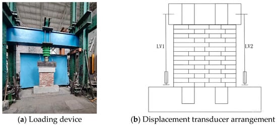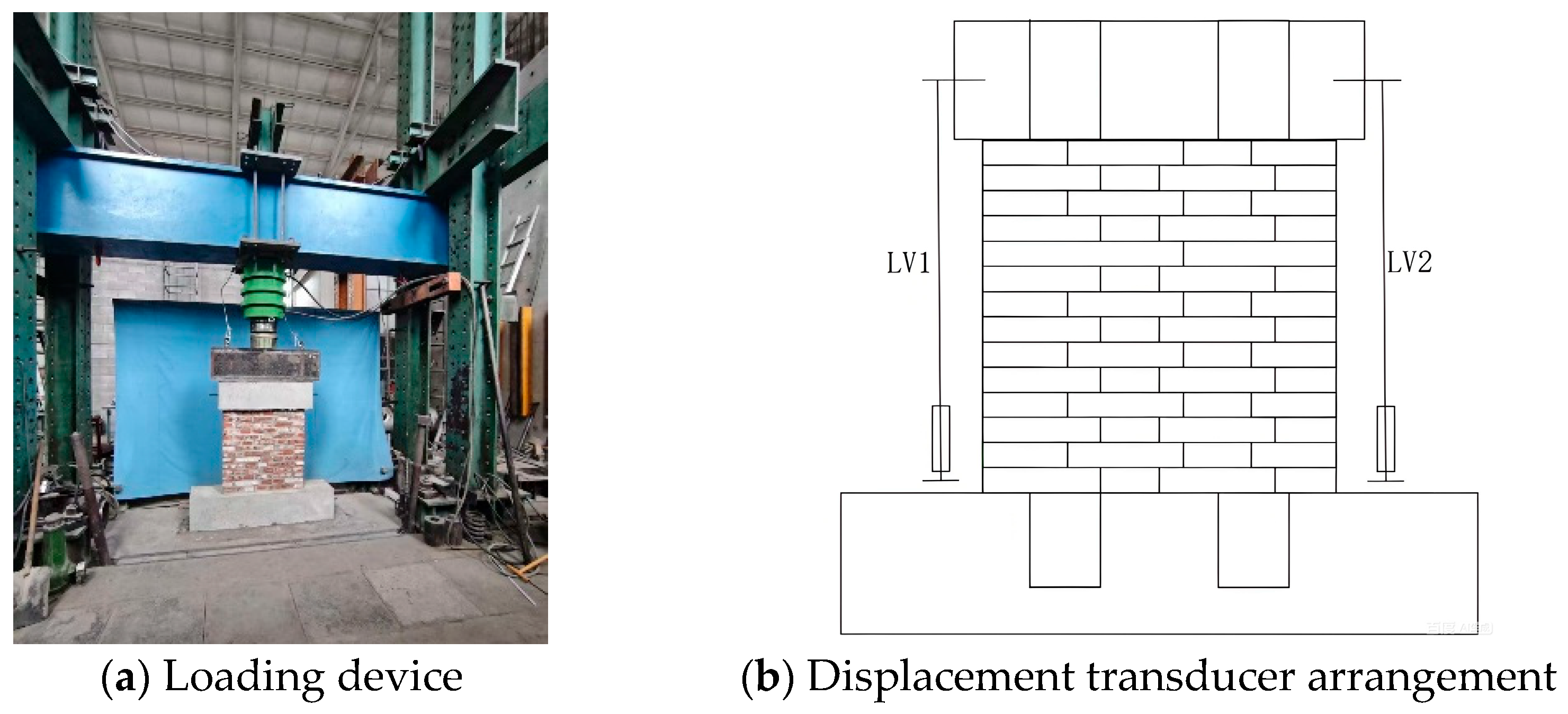 The force-controlled loading was performed. Within the 0–360 kN load range, each load increment was set at 60 kN. The subsequent load increments were set at 30 kN once 360 kN was reached. The dwell time was set as 1 min. When the first crack appeared in the specimen, the cracking load was recorded. As the loading process progressed, the development of wall cracks was recorded until the masonry wall failed and could no longer bear the load.