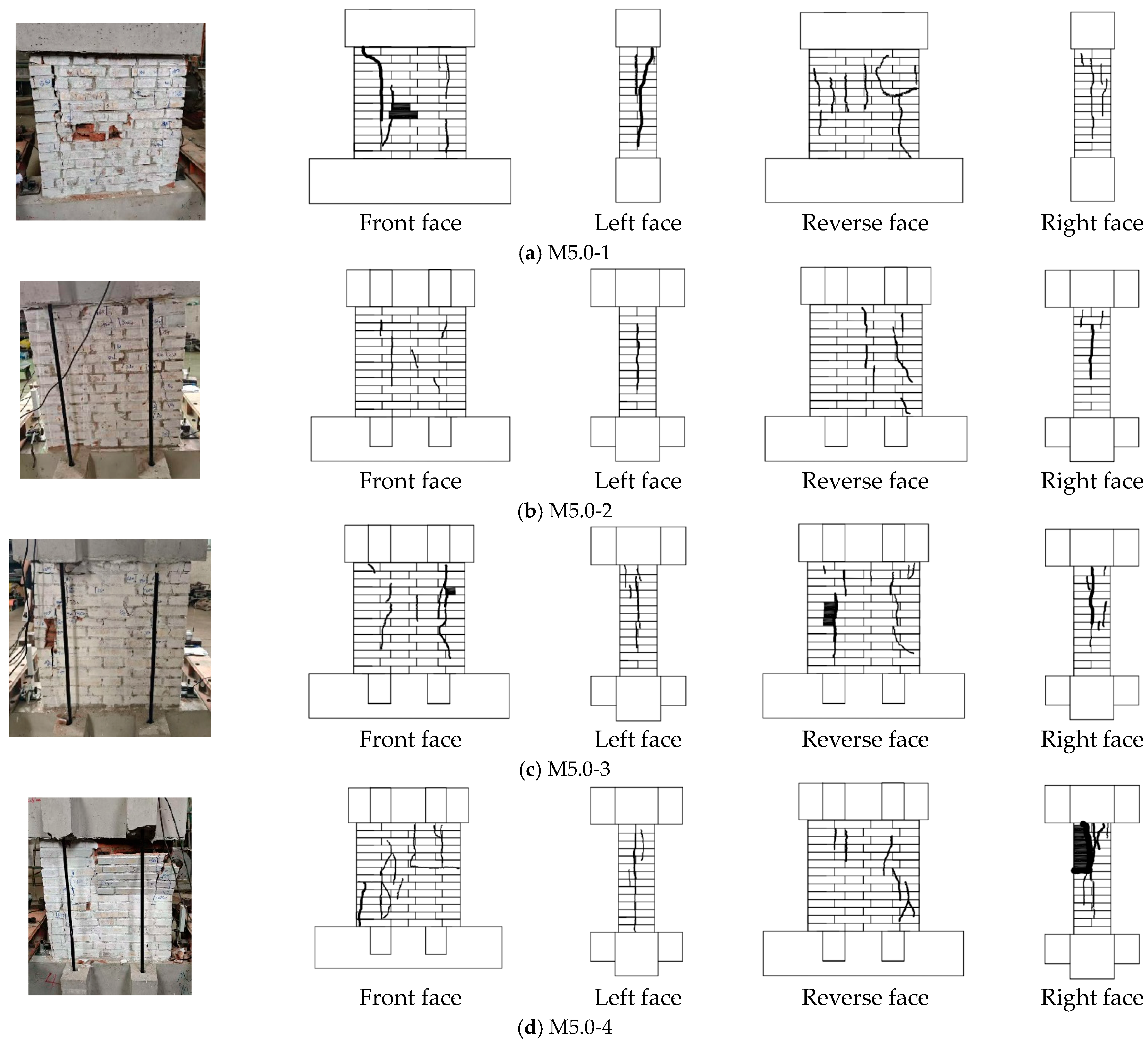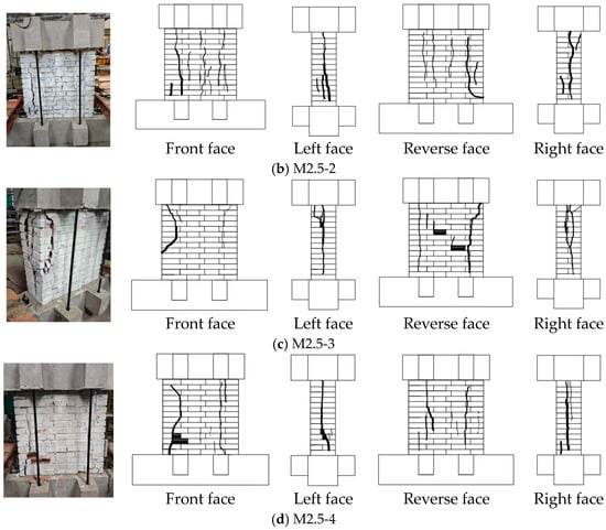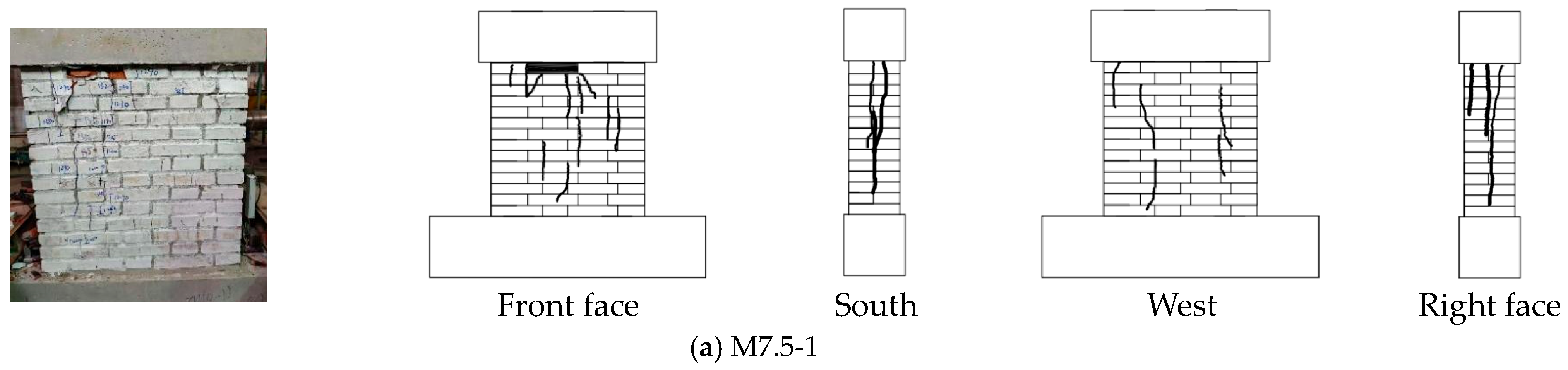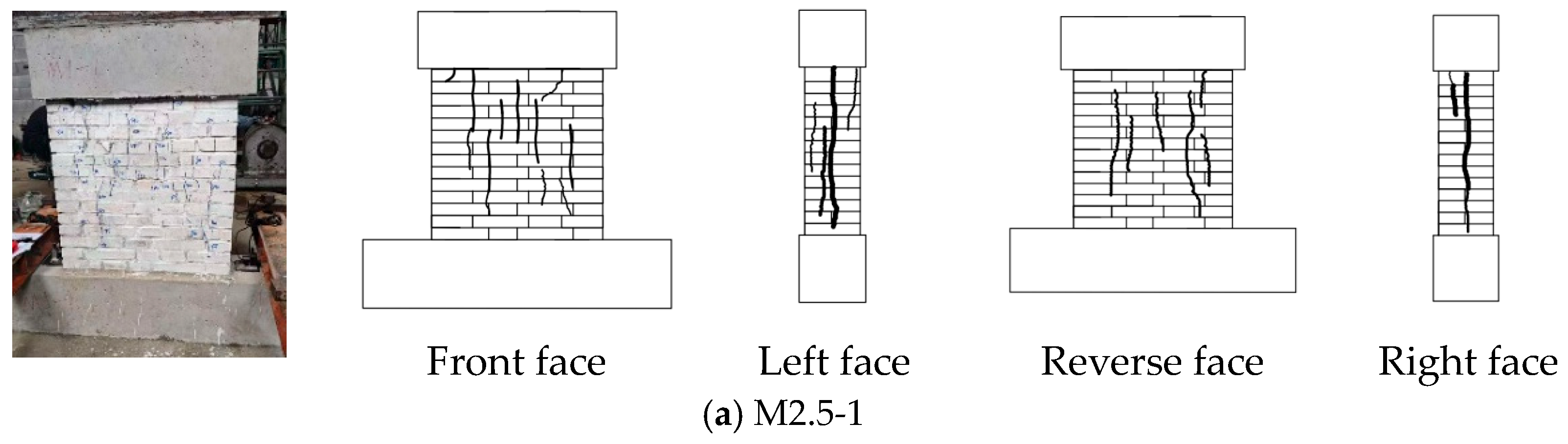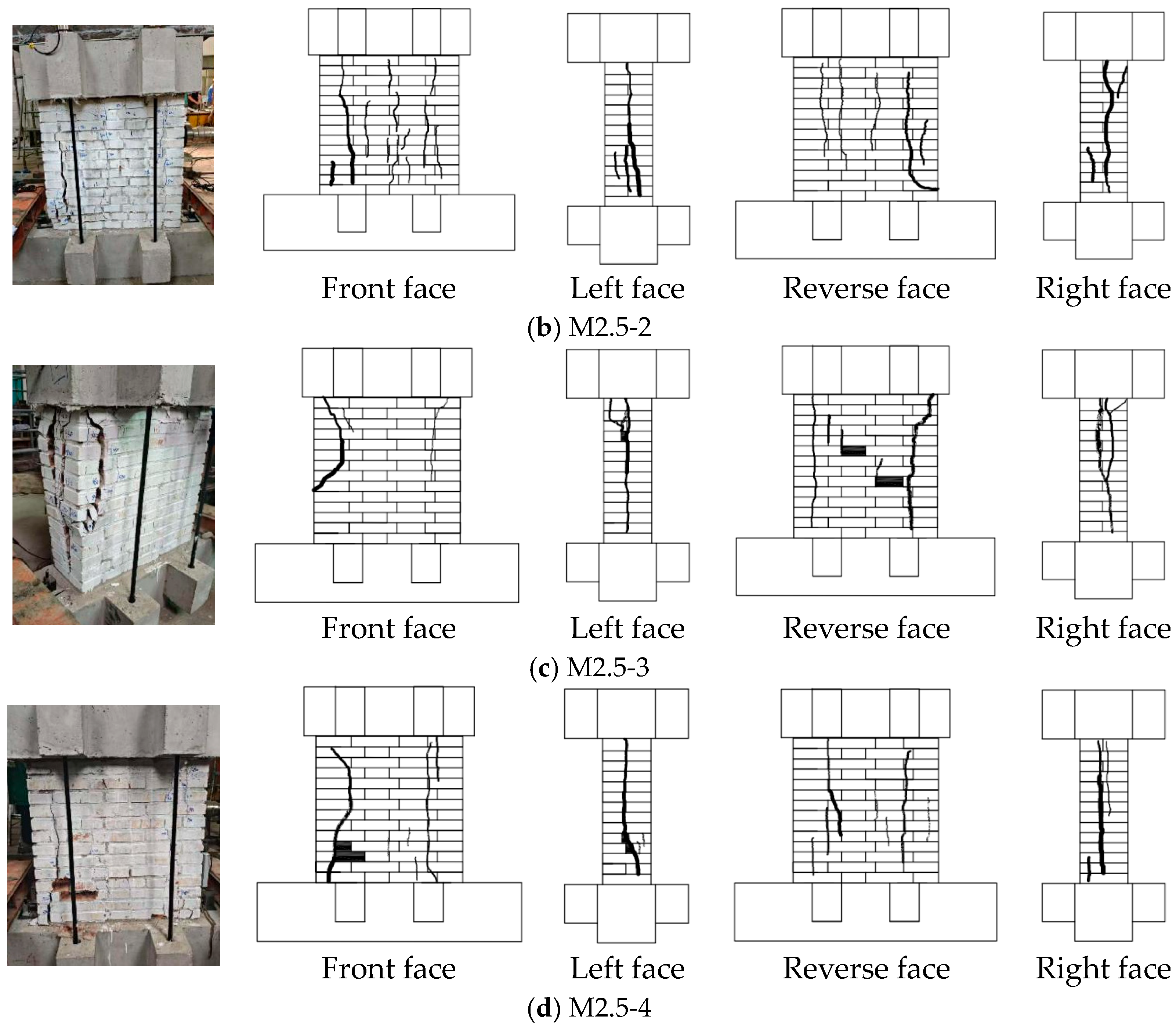 Table 5. The results indicate that when construction loads are considered, fine cracks appear in specimens M2.5-2, M2.5-3, and M2.5-4 at loads of 600 kN, 820 kN, and 899 kN, respectively. Due to higher porosity, the mortar expands laterally more at the joint interface than at the base interface, resulting in stronger tensile stress in the bricks at the top of the wall. Consequently, most vertical initial cracks appear at the top of the wall. Subsequently, cracks continue to develop. When the compressive load reaches 1000 kN, specimens M2.5-2, M2.5-3, and M2.5-4 exhibit continuous vertical cracks. This load value is 28% higher than that corresponding to specimen M2.5-1. When loaded to 1104 kN, 1210 kN, and 1316 kN, respectively, specimens M2.5-2, M2.5-3, and M2.5-4 exhibit uncontrollable widening of cracks, with bricks being crushed or extruded from the wall. The load rapidly decreases, and the maximum crack width exceeds 8 mm. Specimen M2.5-1 exhibits similar phenomena, with a maximum crack width of 12 mm being recorded at the end of the experiment.