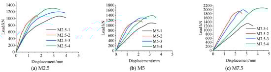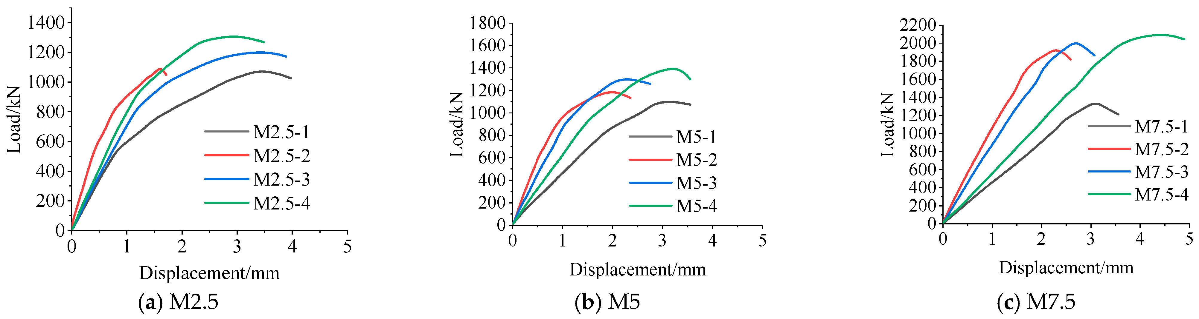 Figure 8. When the loads are low, the vertical deformation of the walls exhibits an approximately linear relationship with the load. Subsequently, the walls gradually enter an elastic–plastic deformation state, accompanied by the appearance, cracking, expansion, and failure. In terms of deformation, the maximum elastic deformations for specimens M2.5-4, M5-4, and M7.5-4 are 1.20 mm, 1.50 mm, and 2.43 mm, respectively. This indicates that higher mortar grades result in greater upper limits for elastic deformation. Once the brick wall enters the elastic–plastic stage, construction loads reduce the elastic–plastic deformation under identical load conditions. For instance, specimen M5-1 exhibits the greatest elastic–plastic deformation, while specimens M5-2, M5-3, and M5-4 demonstrate lower elastic–plastic deformations than the result of M5-1 under the same loading conditions. This is because construction loads increase mortar density and induce a compaction effect, thereby reducing mortar deformation during subsequent loading.