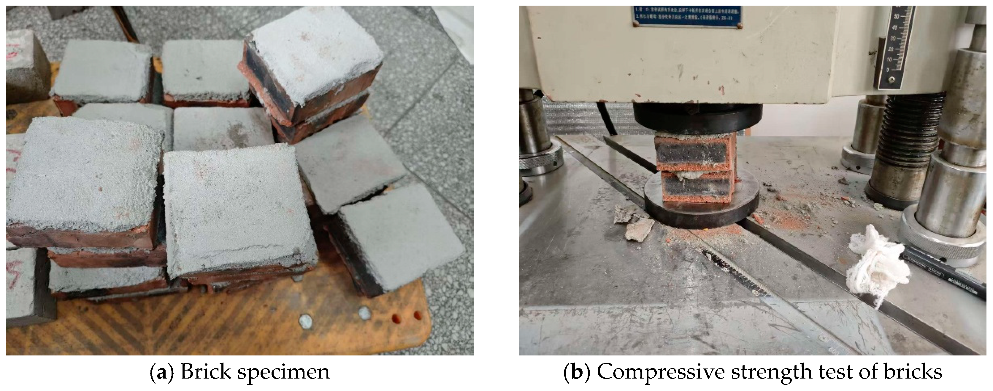Compressive strength tests were conducted on brick blocks and mortar. Twelve brick specimens were prepared in accordance with the Test Methods for Wall Bricks (GB/T 2524-2012) code [