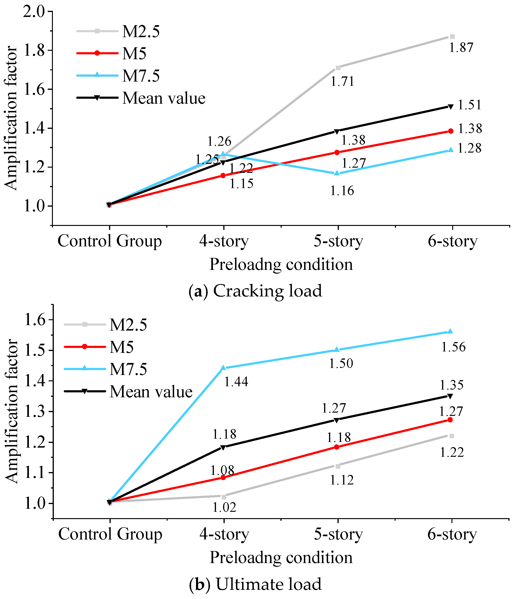 The results indicate that the preload has a greater effect on the cracking load of walls with lower mortar strength grades (M2.5) than on those with higher grades (M5 and M7.5). For instance, the amplification factors for the cracking loads for M2.5-3 and M2.5-4 specimens are 1.71 and 1.87, respectively, which are both approximately 26% higher than the corresponding results for walls made with M5 and M7.5 mortar. However, the pattern for the ultimate load amplification factors is the opposite of that for the cracking load amplification factors. This indicates that preloading has a more pronounced effect on increasing the ultimate load capacity of high-strength mortar brick wall specimens. For instance, the ultimate load amplification factors for the M2.5-2 and M5-2 specimens are 1.02 and 1.08, respectively, whereas the ultimate load amplification factor for the M7.5-2 specimen is 1.44. The amplification factors of ultimate loads for M2.5-4 and M5-4 specimens are 1.22 and 1.27, respectively, while the result of the M7.5-4 specimen achieves a coefficient of 1.56.