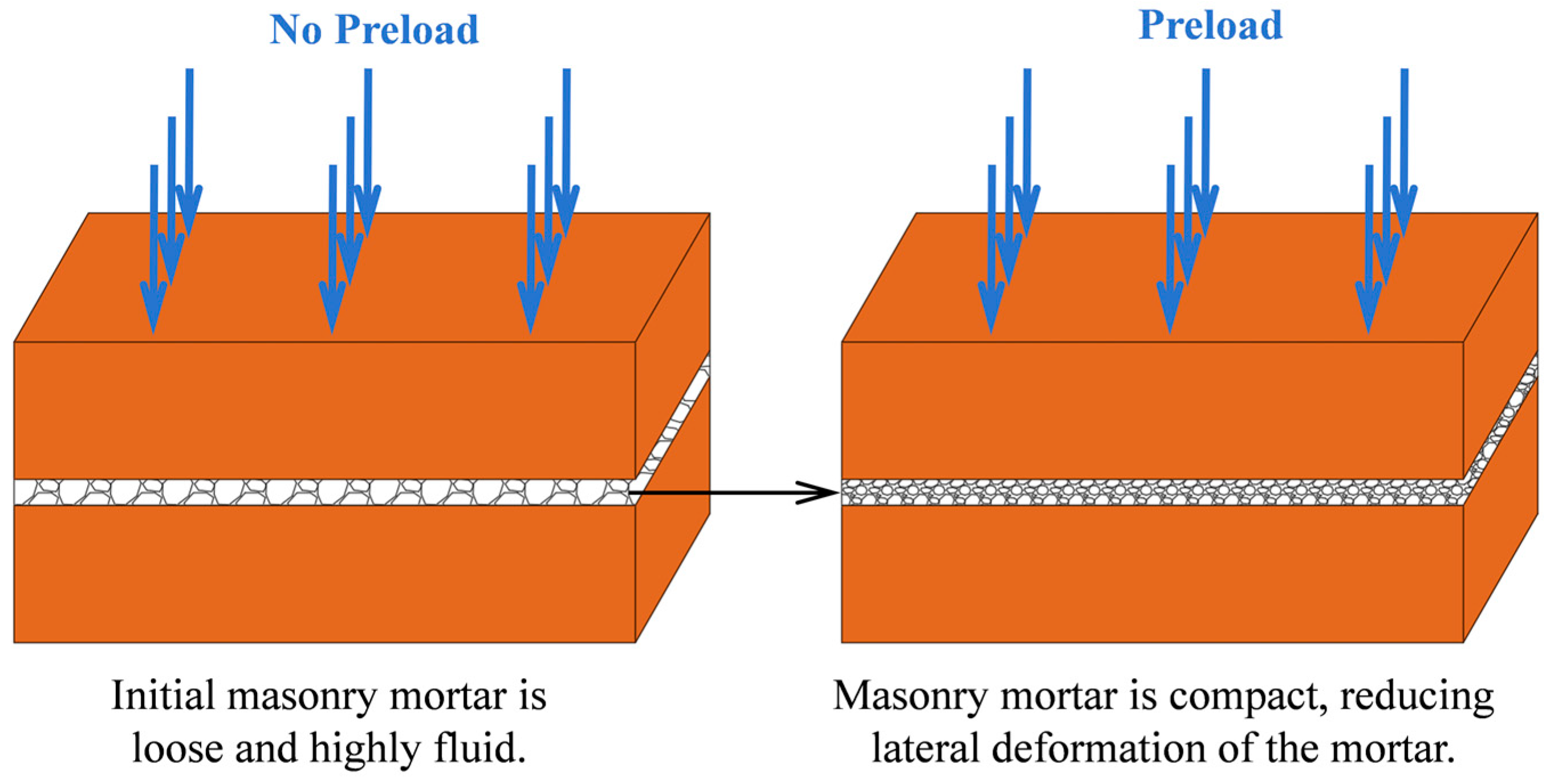 The failure mode of brick masonry walls is governed by the principal tensile stress failure criterion. The cracking and failure occur when the maximum principal tensile stress in the masonry material exceeds its tensile strength. During the initial stages of the construction, the mortar is weak and fluid. The tensile stresses induced by lateral deformation of the mortar are negligible and will not cause tensile failure of the bricks. As the increase in the construction loads and time conditions, the lateral deformation, density, and compaction of the mortar gradually increase. When a preloaded brick wall is subjected to additional loading, the Poisson effect in the mortar weakens, reducing the vertical deformation of the walls. The reasons for the increased cracking load and ultimate load include: (i) the preload enhances the bond between the mortar–block interface, mitigating the effects of block surface irregularities; (ii) higher-density mortar exhibits superior material properties; (iii) preloading reduces the inherent non-uniformity of the mortar, diminishing the stress concentration of the bricks at vertical joints; and (iv) the preload causes a portion of the lateral deformation to be released prematurely during the mortar compaction process. Under identical external loads, the lateral deformation of the mortar is reduced, thereby decreasing the tensile stresses within the bricks.