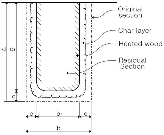 When wood is exposed to fire, if the temperature exceeds a certain level, burning occurs. When the breadth (b) × length (d) of a section of wood is exposed to fire and reduced to a residual section of bf × df, the char depth of the exposed section can be calculated using the equations below [9].