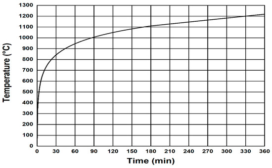 The fire resistance performance tests were conducted in accordance with Korean industrial standards KS F 2257-1 and KS F 2257-6 (Methods of fire resistance tests for elements of building construction—specific requirements for beams) [12]. For the fire temperature curve, we utilized the standard time-temperature curve from ISO 834-1 (Figure 3) [13] and measured the char depth of the specimens as well as their displacement under load.