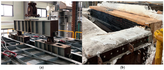 The testing procedure employed a fire resistance test furnace equipped with a burner using liquefied natural gas as fuel. The furnace had three closed sides. A load was applied at four points on the top of the specimen using a hydraulic loading device positioned at the top of the furnace. The peak load was set at 500 kN, with a peak compression length of 1000 mm. Figure 4 illustrates the loading device and the configuration of the load-bearing tests.