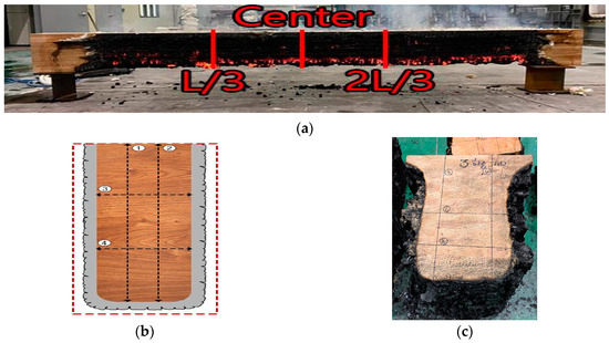 Charring depth measurement of specimens. (a) Measurement locations after fire resistance test; (b) charring depth measurement points; (c) charring depth measurement.
