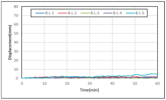 All five glue-laminated Korean larch beam specimens underwent a 60 min fire resistance test in a furnace. All specimens exhibited very stable displacement behavior, meeting the performance criteria. While it is typical for elements like beams to demonstrate increased displacement with rising load, our test specimens did not show any significant differences in displacement behavior. Figure 6 illustrates the changes in displacement over the test duration.