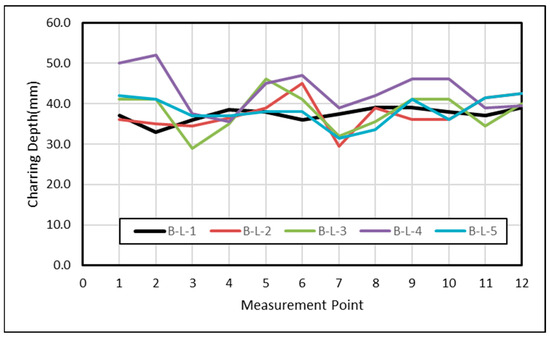 In Figure 7, which illustrates the char depth measured at each of the 12 locations for each specimen, variations in char depth measurements were observed between the width and height dimensions due to the heating of the beam elements on three sides. This discrepancy likely explains why only specimen B-L-4, which had a shorter height, exhibited more significant charring.