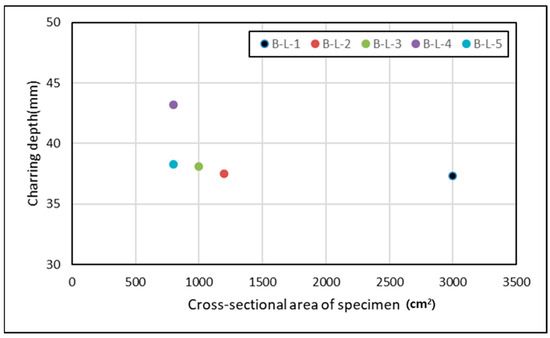 We compared the char depths between specimens B-L-4 and B-L-5. Although these specimens had the same cross-sectional area of 800 cm2, they exhibited a 13% difference in char depth. The graph in Figure 9 illustrates the relationship between cross-sectional area and char depth for each of the five specimens. Based on these results, we concluded that when the cross-sectional area remains constant, greater char depth occurs when the width is shorter than the height. In summary, despite identical cross-sectional areas, the differing moment of inertia values indicate a variation in char properties.