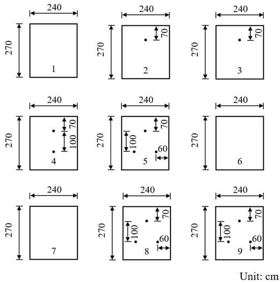 Table 1 presents the reinforcement program for the nine groups of retaining walls. Wall 1 was set as the control group without any reinforcement. Single-hole grouting was adopted in both wall 2 and wall 3, differing in the grouting volume. It is noted that the difference in grouting volume between wall 2 and 3 resulted from the different grouting pressure. Grouting for wall 2 was lower pressure, while that for wall 3 was higher pressure. In both walls, the grouting hole was located at the midline of the wall, 70 cm from the top. Multi-hole grouting was utilized in wall 4 and wall 5. Specifically, two grouting holes were installed in wall 4, while three grouting holes were set in a triangle distribution in wall 5. This is because distributed grouting holes will lead to relatively uniform grouting. In wall 4, two grouting holes were located at the midline of the wall, 70 cm and 170 cm from the top. For wall 5, the upper grouting hole was set the same as wall 4, but there were two additional lower grouting holes located 70 cm from the top and 60 cm from the sides. Unlike the grouting reinforcement used for walls 2~5, wall 6 and wall 7 were reinforced with steel mesh hanging on the wall surface and cast-in-place concrete. According to construction experience, molds used for pouring concrete are easily broken when the thickness of concrete cover exceeds 20 cm. In addition, Li et al. chose 5~20 cm thickness of concrete cover beams to investigate the effect of that on bending strength and found that the bending strength increased with the enhancement of concrete cover thickness []. Thus, to consider the cost and reinforcement performance comprehensively, 10 cm and 20 cm were chosen for wall 6 and wall 7, respectively. Wall 8 and wall 9 were reinforced using a combination of grouting and concrete cover. The grouting hole arrangement was the same as for wall 5, and the concrete thickness was 10 cm for both. However, there were steel grouting pipes placed inside the grouting holes of wall 9. The arrangement of grouting holes is shown in Figure 1. In addition, for walls 4~5 and 8~9, higher grouting pressures were adopted.