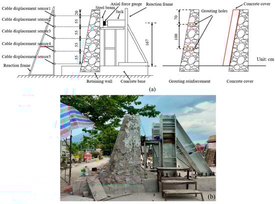 In construction engineering, retaining walls are the most common type of support structure used to sustain embankment fills and slope soils, preventing large deformations and structure instability, such as landslides, landslips, etc. Masonry retaining walls are widely used due to the availability of local materials and their low cost. These walls are built by rubble, rough and cut stones, or masonry blocks with mortar. Due to the structural and material characteristics of masonry retaining walls, several problems may arise during construction, such as incomplete mortar filling and inadequate compaction of the internal structure, which will further lead to wall cracking, deformation, and failure []. Common methods widely used in retaining wall reinforcement, such as soil nailing [] and grouting prestressed anchor cables [], are not applicable, as disturbance during construction would further lead to the loss of wall integrity.