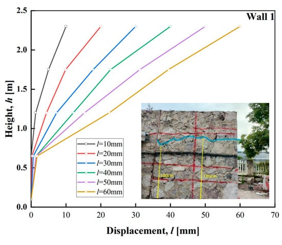 Figure 4 displays the displacement of cable displacement sensors of wall 1. It is shown that deformation was predominantly observed above 100 cm, where cracks occurred and serve as hinges, resulting in rotational deformation overall. Due to its gravity-based design and the rotational deformation, the maximum displacement under sustained horizontal loads occurred at the top of the wall.
