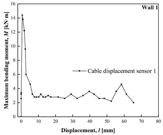 Figure 5 illustrates the relationship between the maximum bending moment and displacement of wall 1. The curve exhibited three distinct phases. First, as the displacement increased from 0 to 0.5 mm, the maximum bending moment increased sharply from 0 to 14.4 kN·m, where no cracks were observed in the wall during this phase. Afterwards, with the further increase in displacement from 0.5 to 8.1 mm, the maximum bending moment rapidly decreased to 3.2 kN·m, accompanied by the appearance of a crack. Third, when displacement exceeded 8.1 mm, the maximum bending moment fluctuated and then remained constant in a small range. Meanwhile, cracks propagated to the front face of the wall, which resulted in small cracks appearing above the main crack and leading to separation between the upper and lower parts of the wall. The ultimate bearing capacity of retaining wall 1 obtained was 7.2 kN. Therefore, the maximum horizontal load pressure could be calculated as 2.88 kN/m considering that the height of the retaining wall above the base was 2.5 m.