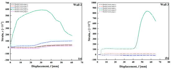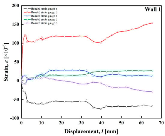 Figure 6 depicts the relationship between the strain and displacement of wall 1. It is observed that gauges c, d, and e showed minimal strain variation, while gauges a and b exhibited significant changes in strain with the continuous load application. When displacement was less than 0.5 mm, the strain rapidly decreased at gauges a, while it increased sharply at gauges b, indicating tension at gauges a and compression at gauges a of the wall, respectively. Once a penetrating crack existed, strain gradually stabilized and remained relatively constant with continuous increasing displacement.
