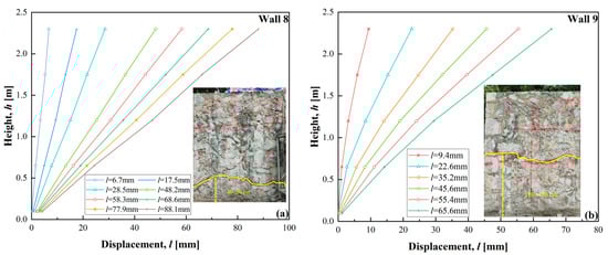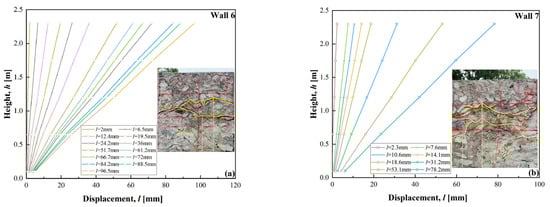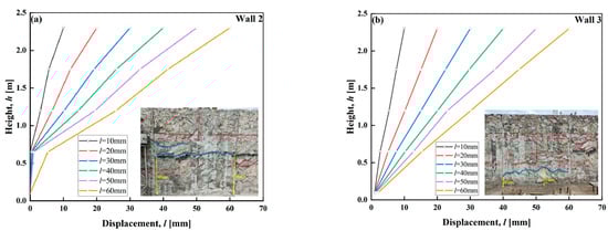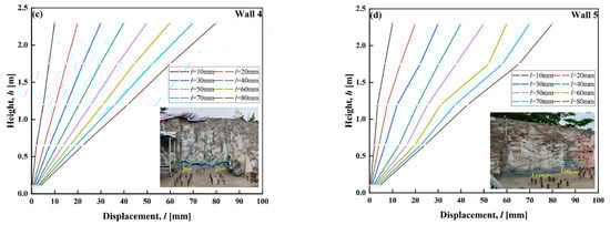 Figure 7 shows the relationship between strain and displacement of grouted reinforced retaining walls under different grouting conditions. On the one hand, for wall 2 with 0.90 m3 grouting volume, it reveals that deformation primarily occurred above 65 cm, as shown in Figure 7a, and the cracks present at 90 cm confirmed this point. While, for wall 3 with 1.25 m3 grouting volume, it is evident that displacement increased almost linearly with the height of cable displacement sensors. The main cracks occurred at 40~55 cm above the foundation, as displayed in Figure 7b. The lower height of cracks meant the higher moment resistance capacity. Thus, wall 3 showed better strength compared with wall 2. On the other hand, for wall 4 with two grouting holes, it can be seen from Figure 7c that the displacement of cable displacement sensors showed a similar trend to wall 3. The cracks occurred 25~35 cm above the foundation. For wall 5 with three grouting holes, cracks mainly occurred 10~20 cm above the foundation. Similarly, the wall with more grouting holes displayed higher capacity.