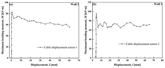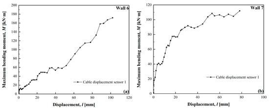 Figure 11 shows the bending moment development curves of wall 6 and wall 7. At the beginning, when displacement at various heights was approximately approaching 0 mm, cracks were not formed. With the increase in displacement, the retaining walls began to crack. The cracking moment of wall 6 was 16.8 kN·m, slightly higher than the performance of wall 2. However, the cracking moment of wall 7 was about 40.6 kN·m, meaning that cracking moment increased with the thickness of the concrete cover. After the cracking moment remained stable for a certain displacement, the maximum bending moment continued to increase in a stepwise fashion. Wall 6 and wall 7 were only loaded to a maximum displacement of 80 mm, but the maximum bending moment was likely to continue to increase with the further displacements.
