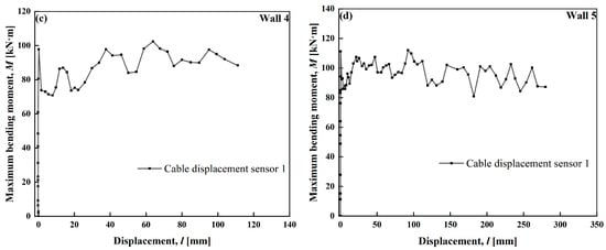 The relationship between maximum bending moment and displacement of grouted reinforced retaining walls under different grouting conditions: (a) wall 2 with 0.90 m3 grouting volume, (b) wall 3 with 1.25 m3 grouting volume, (c) wall 4 with two grouting holes, and (d) wall 5 with three grouting holes.