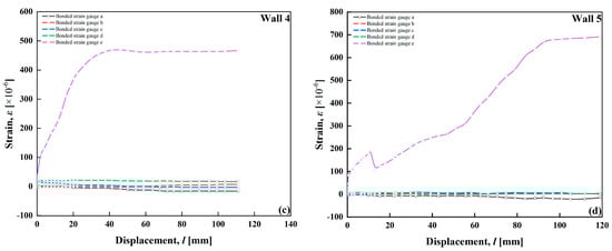 Figure 9 displays the relationship between strain and displacement. For both wall 2 and wall 3, it can be observed that strain gauges a, b, c, and e exhibited little change, while strain gauge d, located at crack height, showed significant compressive strain. However, the strain of wall 2 increased at the initial stage, while that of wall 3 kept constant at first and then sharply increased, which resulted from different heights of cracks. However, for both wall 4 and wall 5, strain gauges a, b, c, and d kept almost constant, while strain gauge e at the lowest height, located at crack height, showed significant compressive strain.