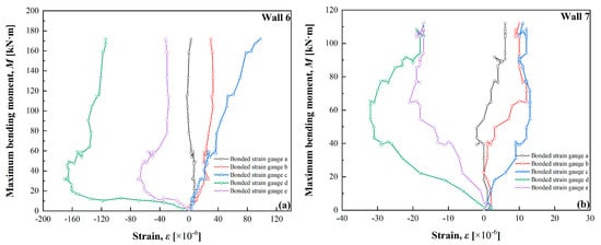 The relationship between the maximum bending moment and strain of the wall and concrete cover is shown in Figure 12. On the one hand, bonded strain gauges a, b, and c on retaining wall 6 and wall 7 show positive strains, while bonded strain gauges e and f show negative strains. This indicates that area above the crack was under tension, while the area lower than crack was compressed. Furthermore, bonded strain gauge d exhibited the largest negative strain, and bonded strain gauge c shows the largest positive strain, confirming the crack formed between their respective heights. On the other hand, all embedded strain gauges exhibited negative strain before cracking. After the walls cracked, the strain recorded by strain gauges C, D, and E rapidly increased to positive values with similar trends. This indicated that the concrete cover transitioned from a compression state to a tension state. Gauge D showed the largest strain, while gauge E displayed slightly smaller strain, which is consistent with the observations from bonded strain gauges. In addition, the strain of concrete cover of wall 7 was smaller than wall 6, indicating that the thicker concrete cover had a good strain resistance.
