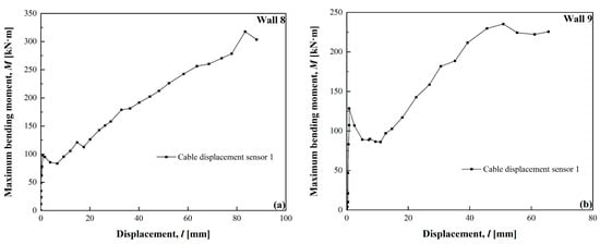 The relationship between maximum bending moment and displacement of composite reinforced retaining walls: (a) wall 8 without steel grouting pipes and (b) wall 9 with steel grouting pipes.