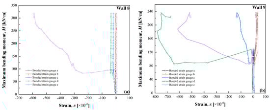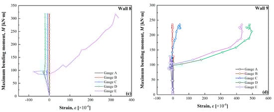 Figure 15 shows the relationship between maximum bending moment and strain of the wall and concrete cover for wall 8 and wall 9. Bonded strain gauges located above the crack showed minimal and almost constant values, meaning that combination of concrete cover and grouting could significantly enhance strength of the retaining wall, while those below the crack exhibited compression strain. In addition, as shown in Figure 15c,d, all embedded strain gauges exhibited small compression strain before cracking. After cracking, gauges located below the crack height rapidly increasing values, while the other gauges showed little change or remained unchanged, in line with the observations from the bonded strain gauges.