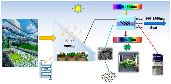The schematic of the novel solar greenhouse with the NSS-PCM system is depicted in Figure 1. The NSS-PCM system is mainly composed of acrylic glass, nanofluids, PCMs, a serpentine copper tube, a water pump, a heat storage tank, and an aluminum groove, respectively. The nanofluid spectral splitting (NSS) receiver transmits the effective spectrum of plant photosynthesis (300–800 nm) for the growth of plants while absorbing the remaining spectrum of sunlight (800–1500 nm) to generate heat [16]. The nanofluids flow in a channel composed of two glass plates. The PCMs are placed in the aluminum groove on the back of the NSS-PCM system for storing heat to warm the greenhouse during nighttime. Nanofluids not only transmit the plant photosynthesis active spectrum required by plants for plant growth but also absorb the rest of the spectrum of sunlight. Organic paraffin acts as the PCM. The serpentine copper tube is placed in the middle of the PCMs. The nanofluids absorb heat and flow into the copper tube to heat the PCMs for heat storage. PCMs release the heat to warm the greenhouse to maintain an appropriate temperature for the plants and promote plant growth during nighttime. The heat storage water tank plays a role in heat preservation during the day.