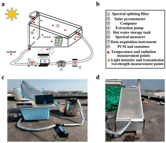 The experiment (Figure 3) was carried out over 75 days, from 28 February to 16 May 2024, in Nanjing (32.06° N, 118.78° E). During the initial 15 days, this experiment mainly tested the thermal performance and sunlight wavelength distribution in the greenhouse roof. In this experiment, a small greenhouse (1.2 × 0.5 × 1.5 m) was built. The roof greenhouse was a south-oriented roof at a 45° angle and 0.72 m2 area (1.2 × 0.6 m) based on the article by Yuan [16]. The greenhouse roof was covered by the NSS receiver. The NSS was composed of acrylic glass plates (PMMA) with a thickness of 10 mm and nanofluids flowing inside at the rate of 7 L/min. The aluminum trough (0.5 × 0.02 × 1 m) was arranged on the back of the greenhouse and was filled with PCMs. The vertical copper tubes were placed in the PCMs. The other four sides of the greenhouse were composed of aluminum plates with a 15 cm thick thermal insulation layer. The CNT nanofluids with a concentration of 1 × 10−6 kg/m3 were used. The organic paraffin wax was used as the PCM. The type of paraffin was ZJ-PCM-A-18. The phase transition temperature was 18 °C, and the latent enthalpy was 200 J/g. The total length of the serpentine copper tube used was about 10 m, and the diameter was 0.01 mm.