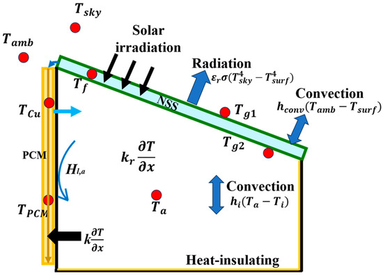 The energy balance equation for the PCMs in the roof greenhouse is given by [45,46]