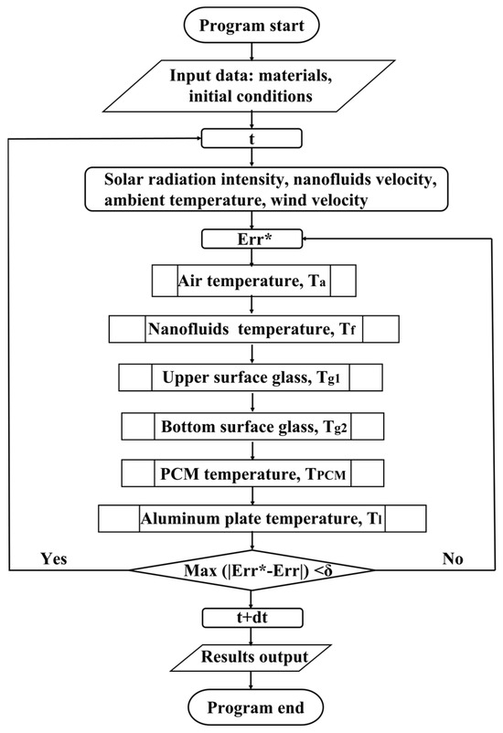 where ρg1 (kg·m−3) is the density of glass cover; δg1 (m) is the thickness of the upper glass panel; cg1 (J·K−1·m−2) is the capacity of the glass panel; Gg1 (W·m−2) is the solar radiation intensity on the upper surface of the glass plate; hc_abm (W·m−2·K−1) is the convective heat transfer coefficient between glass and ambient air; hr_sky (W·m−2·K−1) is the sky temperature radiation coefficient; and hc_g1f and hr_g1f (W·m−2·K−1) are the convective heat transfer coefficient and the radiant heat transfer coefficient between the upper glass panel and nanofluids, respectively.