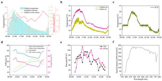 The weather parameters (a), comparison of greenhouse indoor air and outside ambient temperature (b), the temperature of PCMs (c), the photothermal conversion efficiency and thermal efficiency (d), the heat gain of nanofluids and PCMs during daytime (e), and the light intensity distribution inside the greenhouse (f).