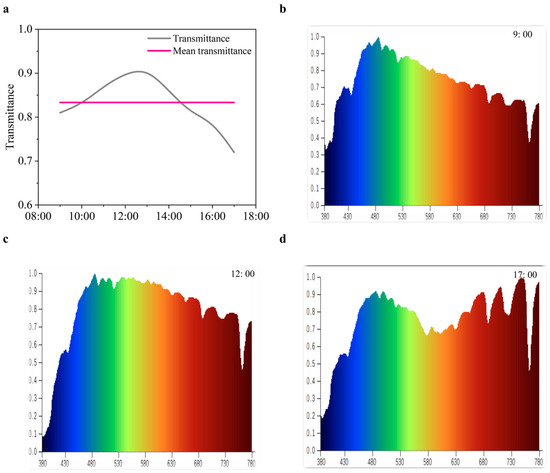 The average transmittance of light (a) and transmittance at 9:00 (b), 12:00 (c), and 17:00 (d).