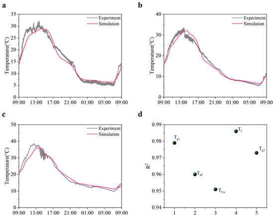 The temperature of the glass cover (a), glass plate (b), aluminum plate on the inner wall of the PCM container (c), and the R2 of other parts (d).