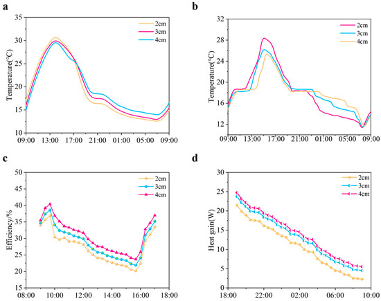 Comparison of indoor air temperature (a), PCM temperature (b), thermal efficiency (c), and heat gain (d) of three different PCM layer thicknesses after optimization.