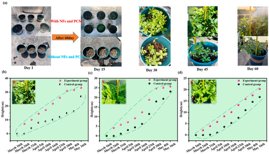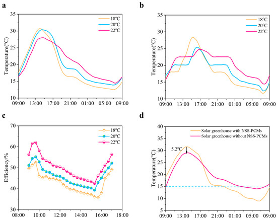 During nighttime, the NSS-PCM system demonstrated excellent temperature control by releasing the heat absorbed during the day, thus providing a warming effect. The results showed that between 06:00 p.m. and 09:00 a.m. the following morning, the internal temperature of greenhouses equipped with this system was 5–6 °C higher than that of those without it (Figure 10d). This nighttime warming mechanism effectively protects crops from low temperatures, preventing growth inhibition due to cold conditions. Particularly in winter or in regions with significant temperature drops at night, a sudden decrease in temperature can lead to freezing or stunted growth in plants and, in severe cases, can result in plant death. The NSS-PCM system provides crucial heat supply during these times by releasing the stored thermal energy in the phase change materials, helping to maintain a relatively constant temperature within the greenhouse, ensuring that crops can continue their physiological activities even during cold nights and early mornings.